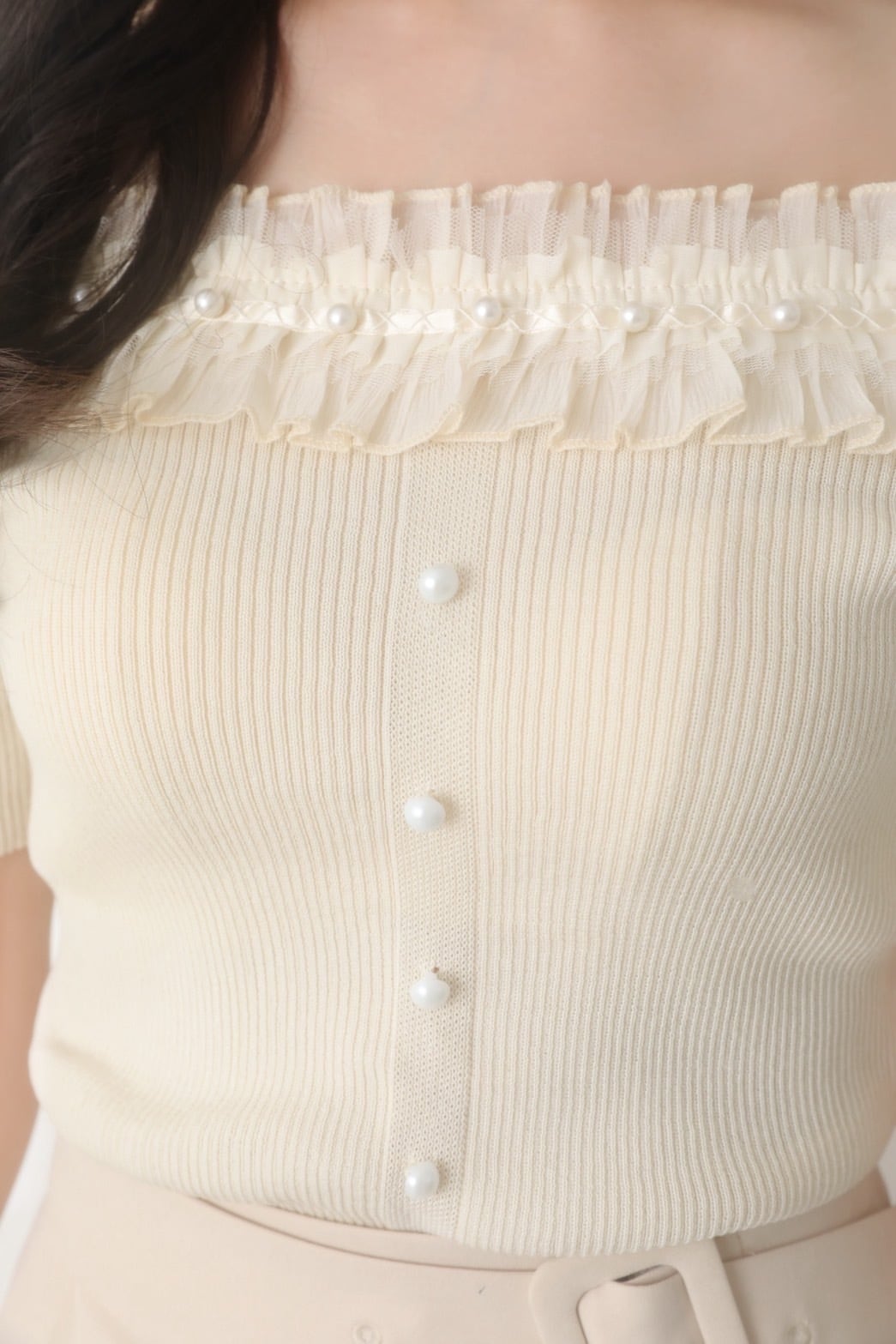 frill off shoulder knit tops
