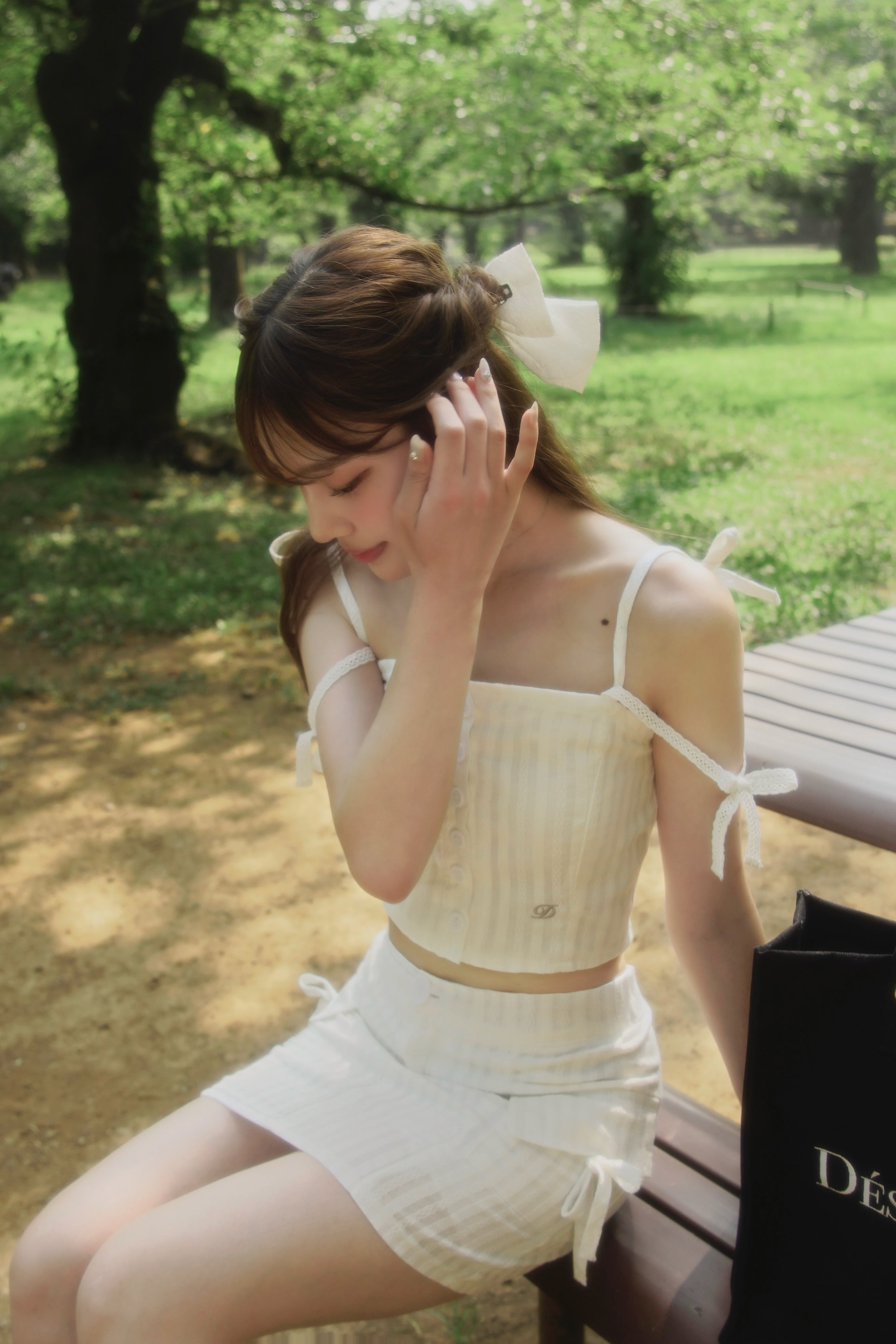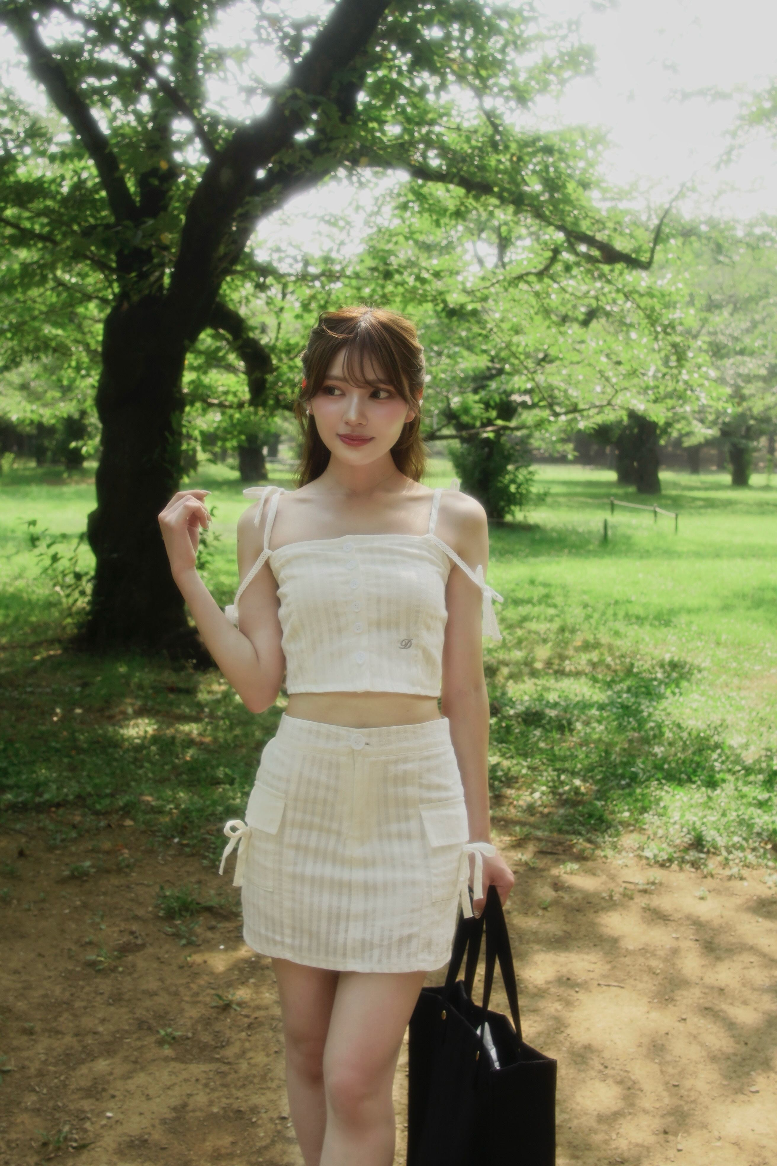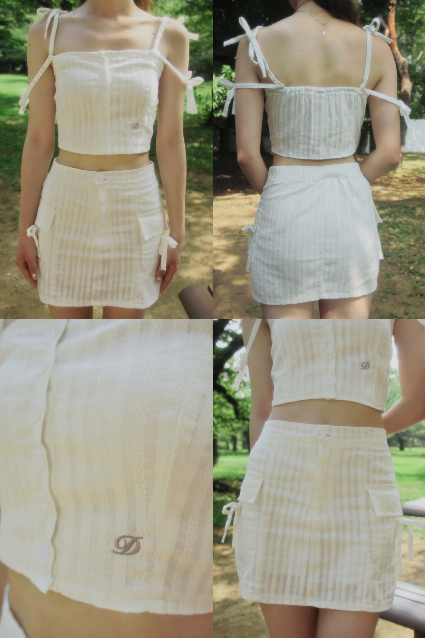 表面感のあるコットンレースを使用し、ナチュラルな風合いとリボンの甘さが魅力のセットアップ。