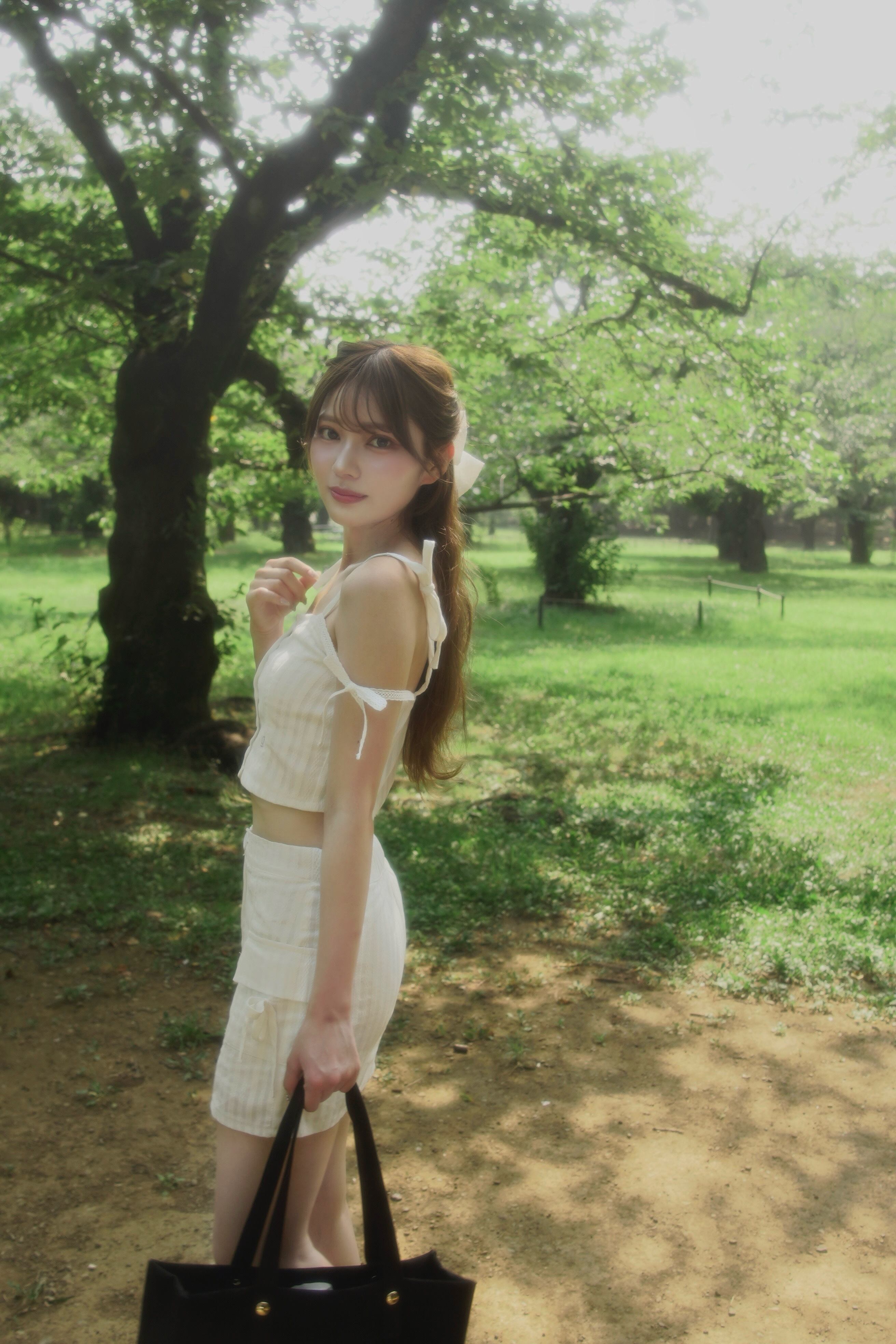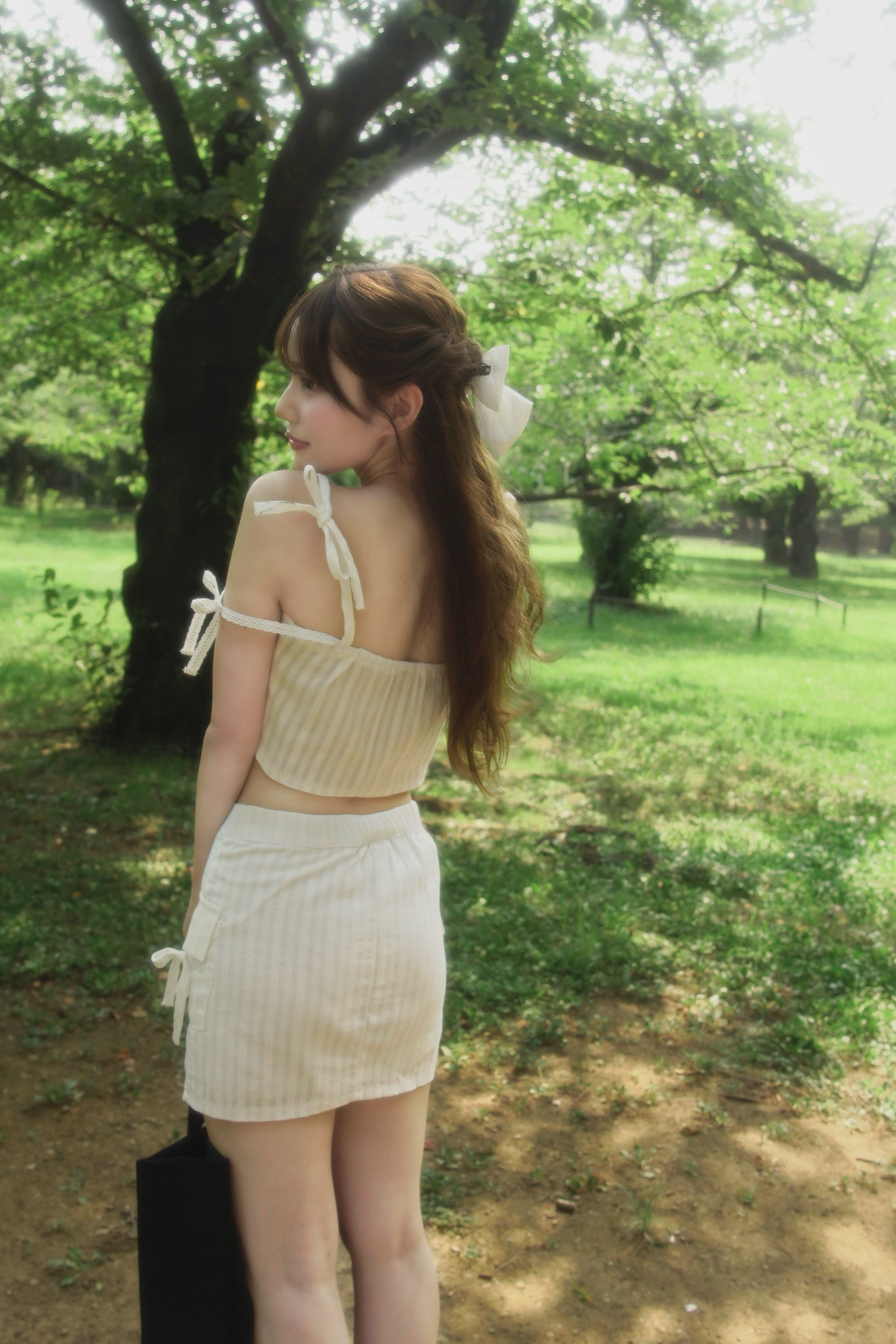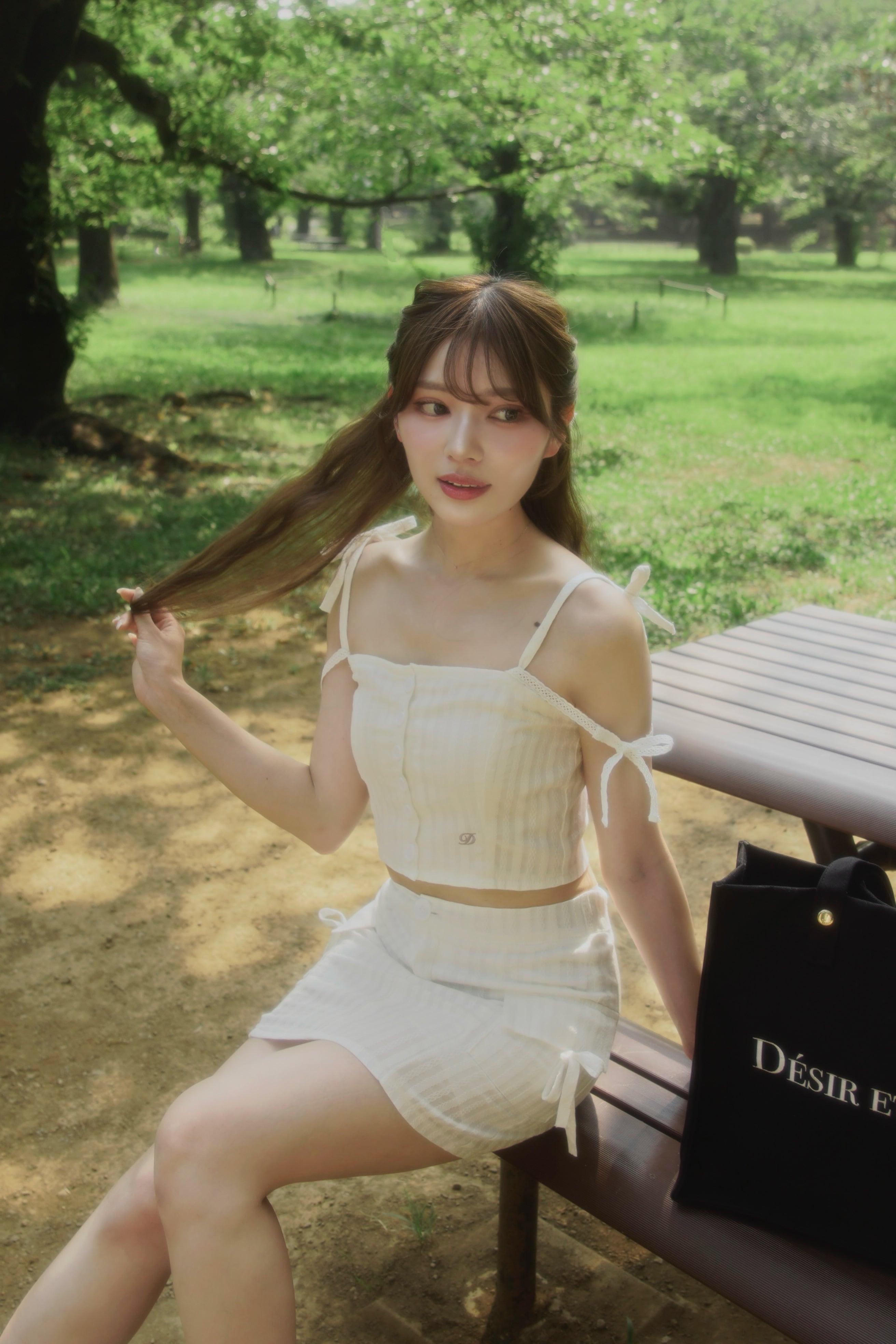 表面感のあるコットンレースを使用し、ナチュラルな風合いとリボンの甘さが魅力のセットアップ。