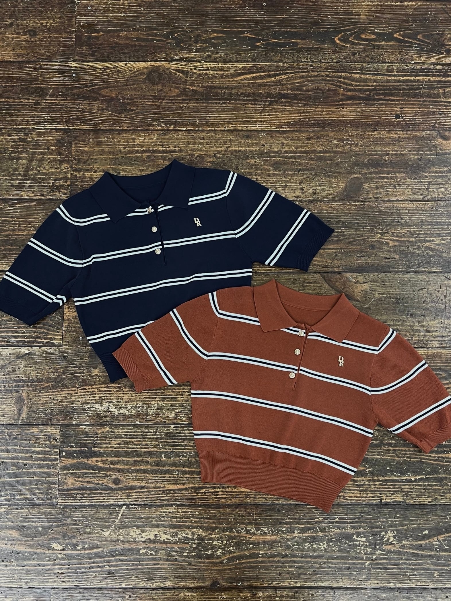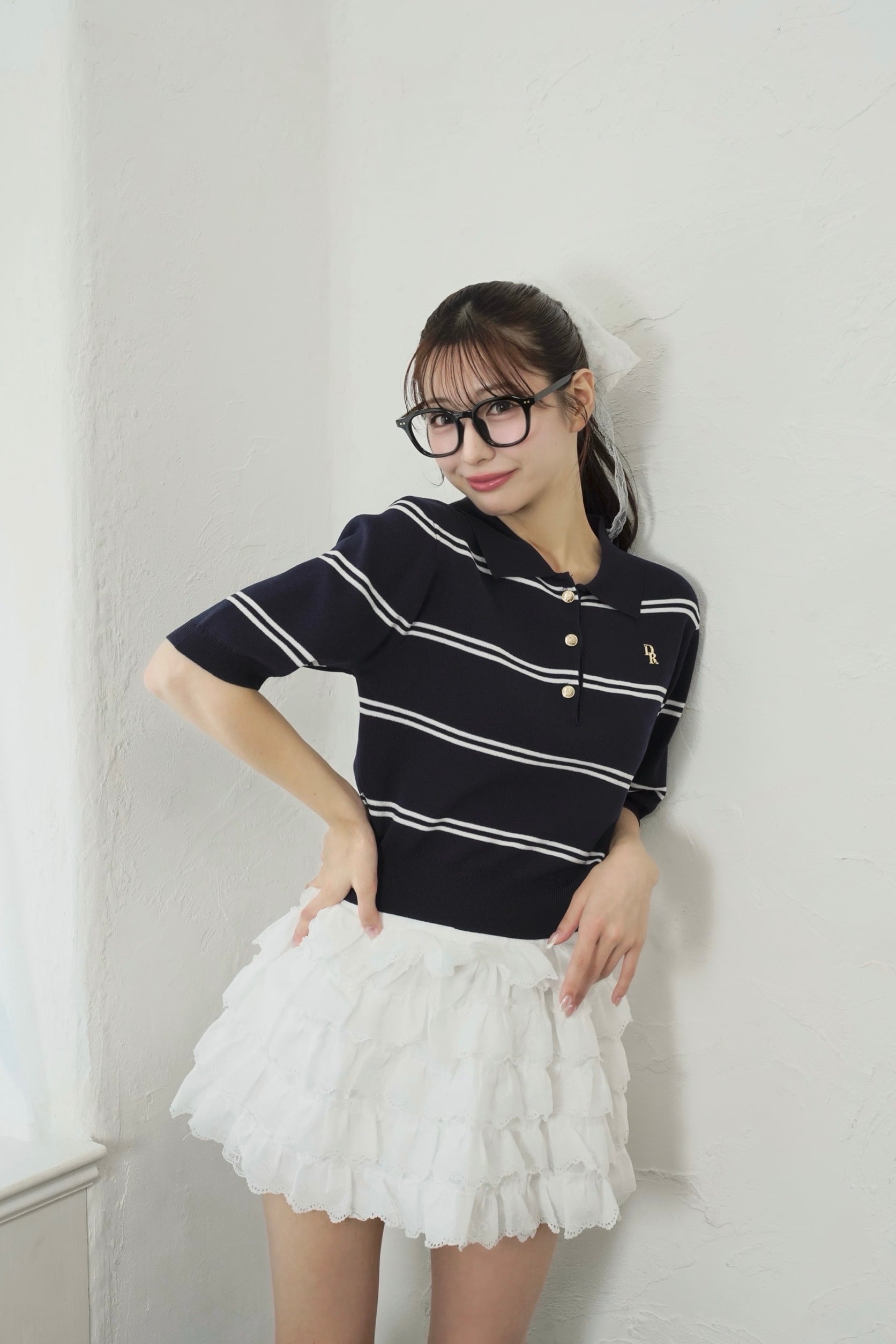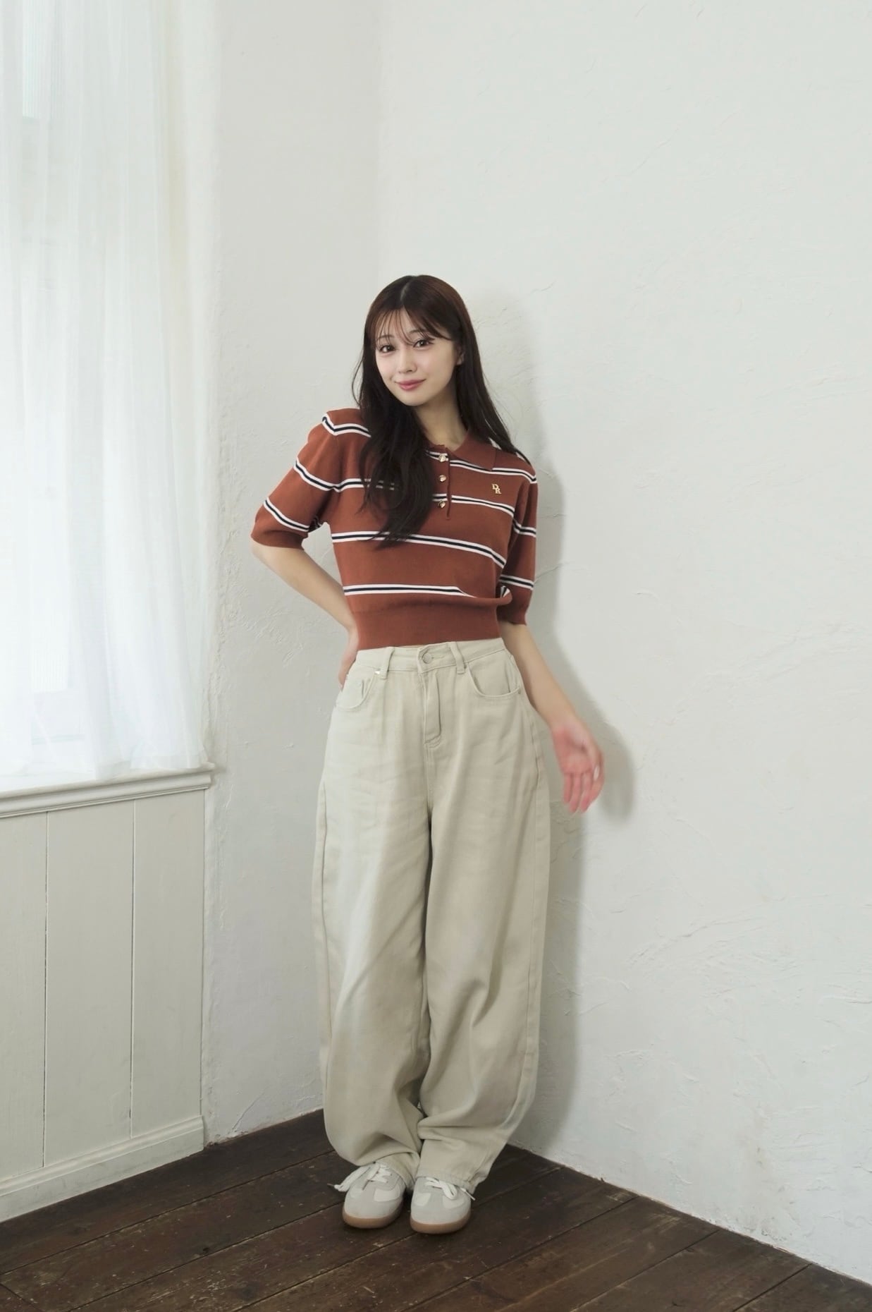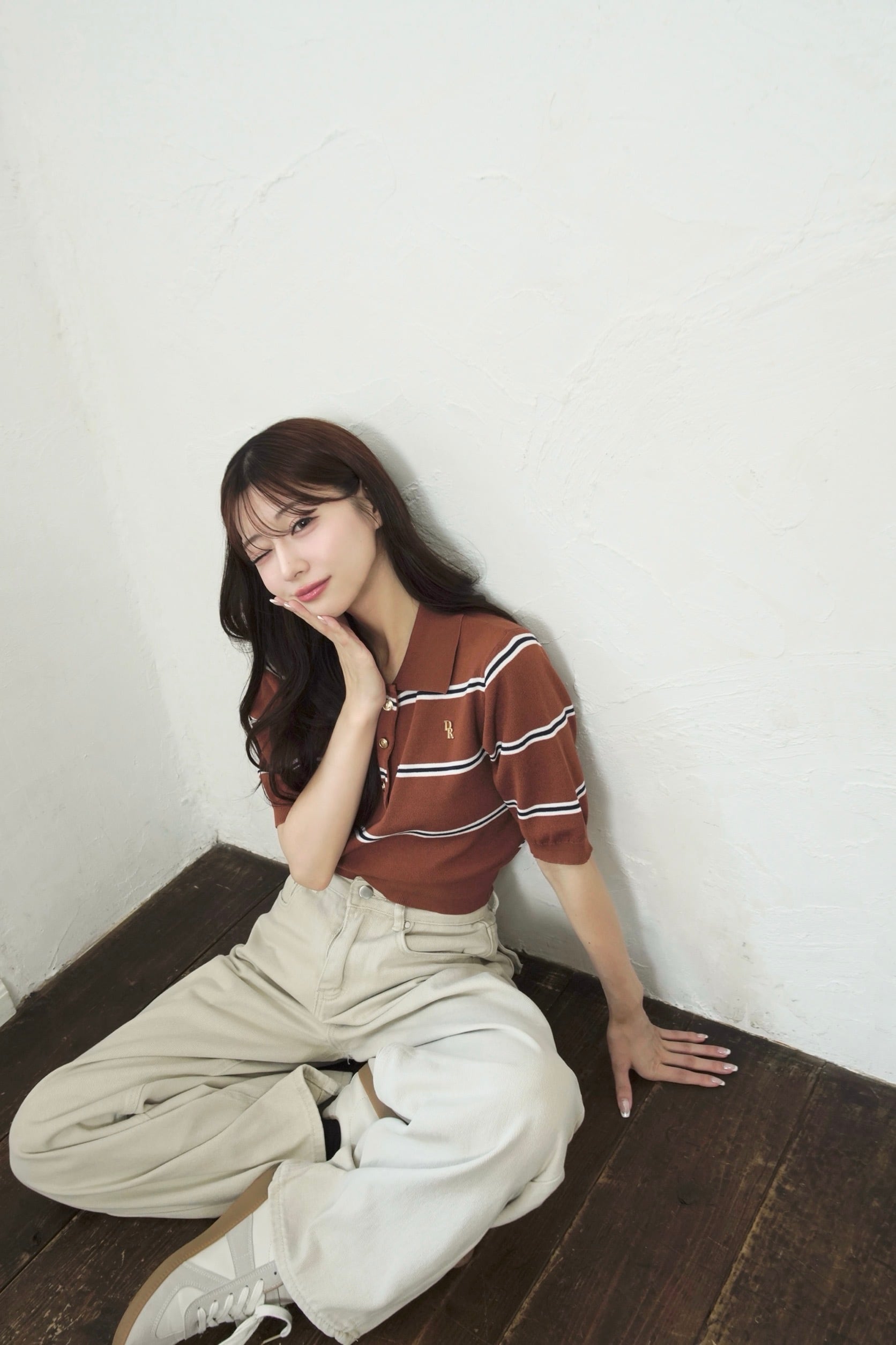 パッと目を惹くボーダー柄が1枚でコーデ映えするポロニットトップス。
