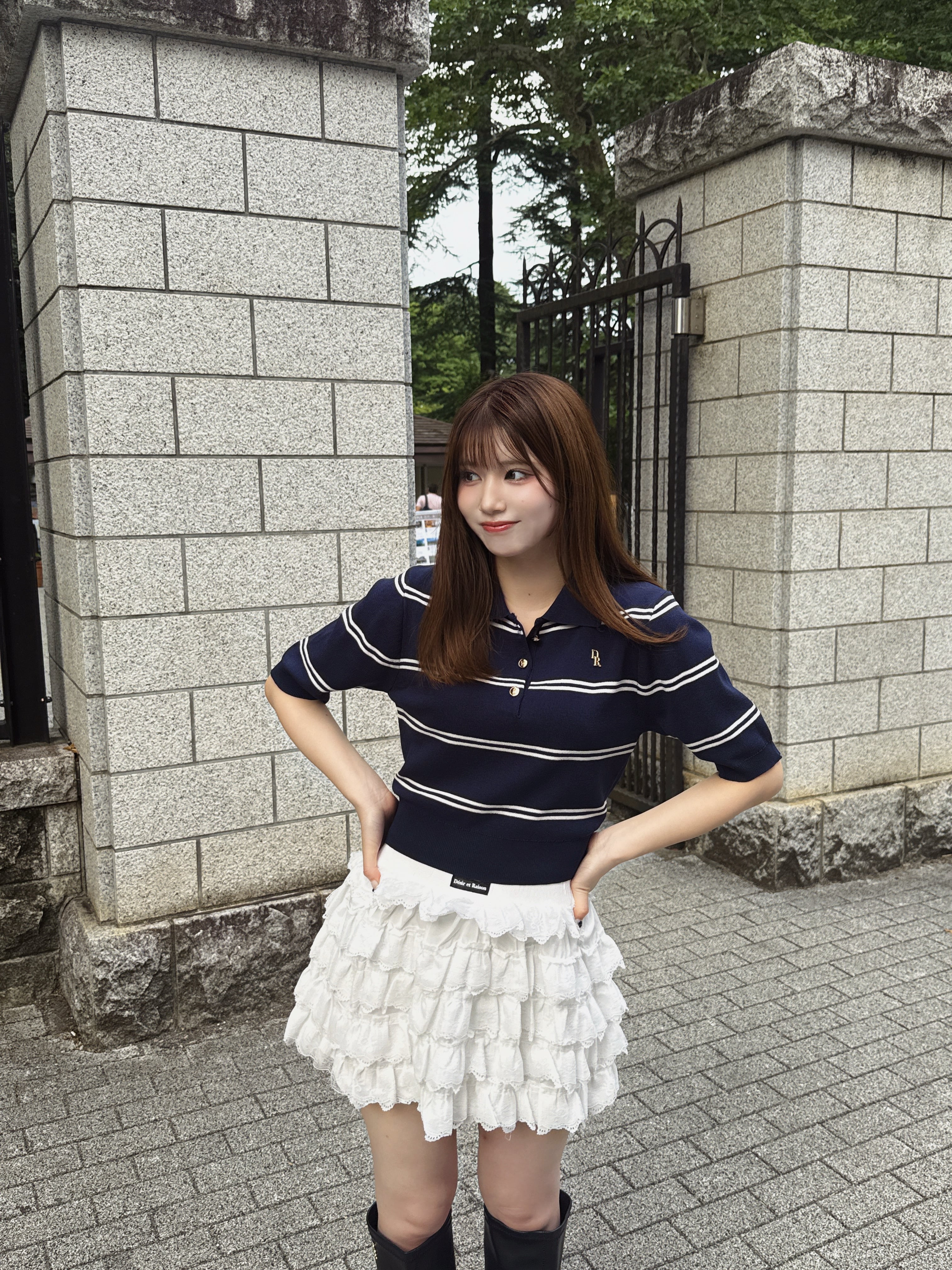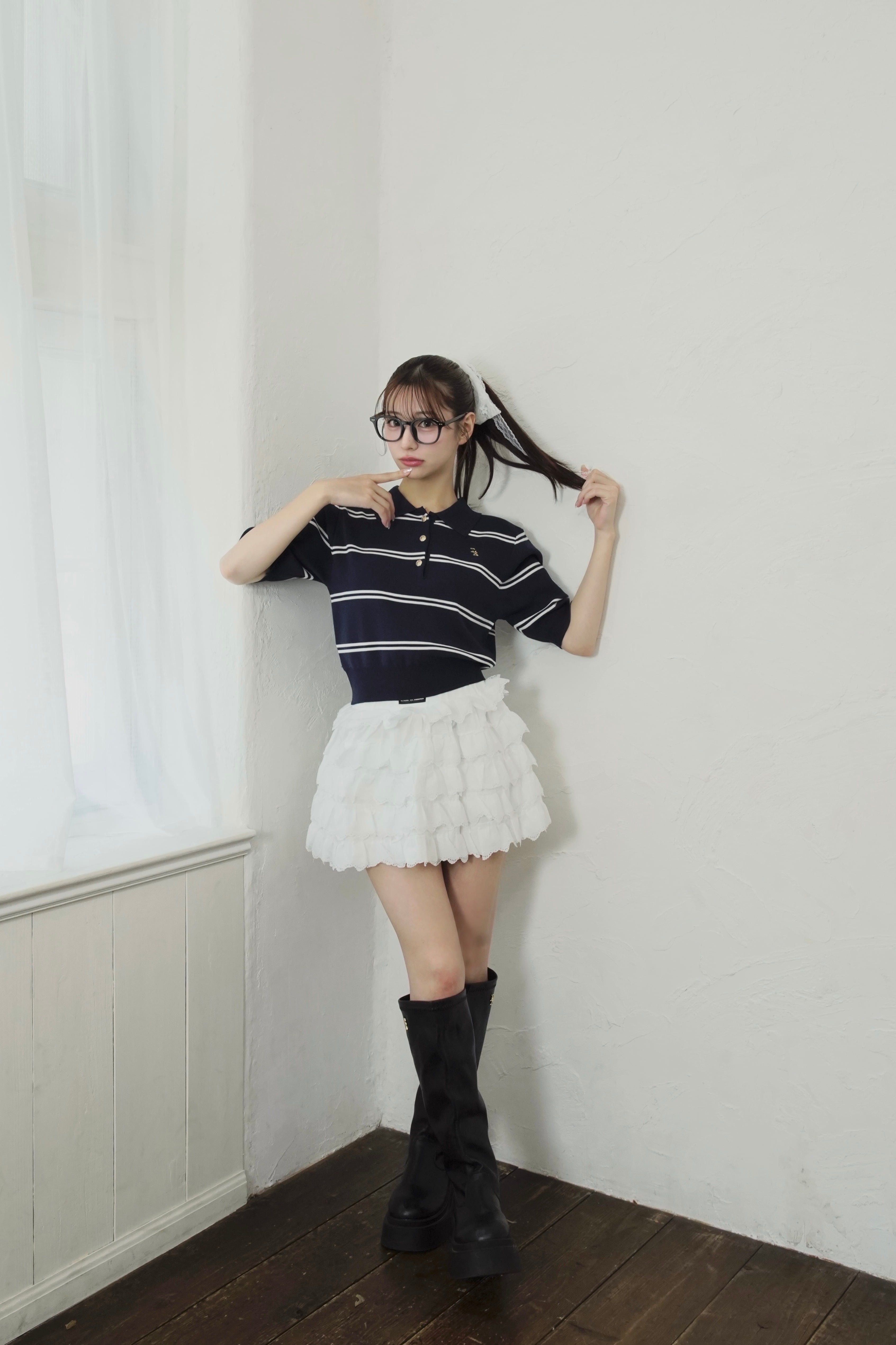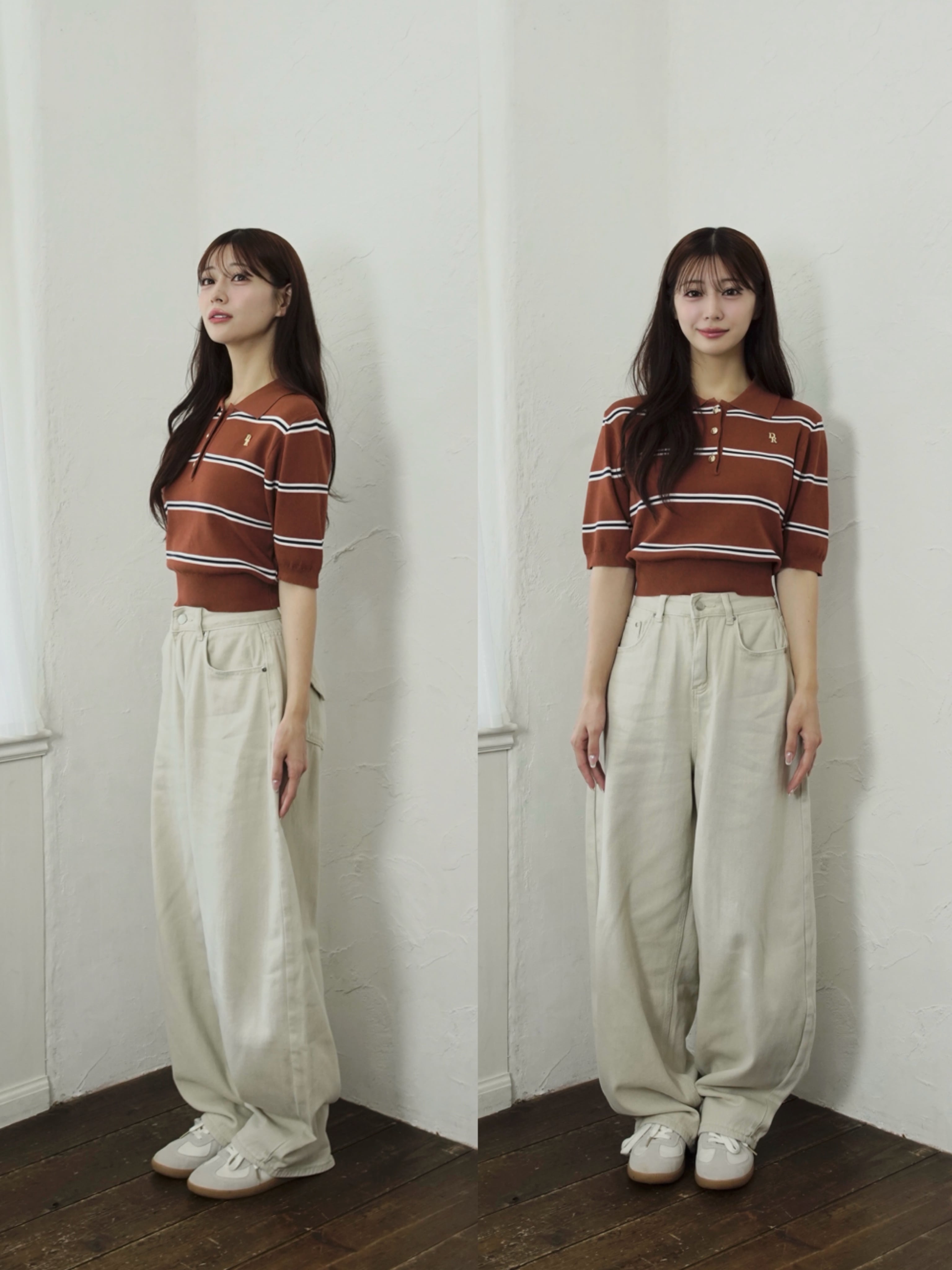 パッと目を惹くボーダー柄が1枚でコーデ映えするポロニットトップス。