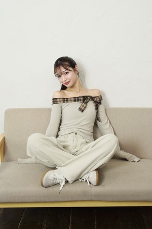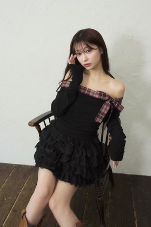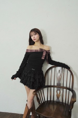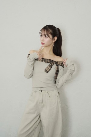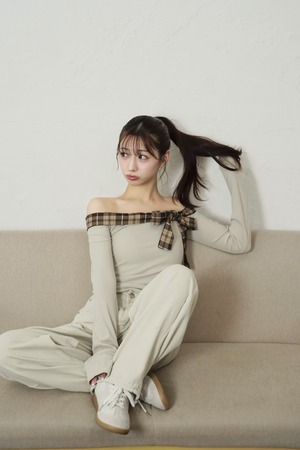 オフショルデザインなのでデコルテや肩のラインが華奢見えするとともに、体に程よくフィットするコンパクトなシルエットが自然とスタイルアップを狙えるのもポイント。