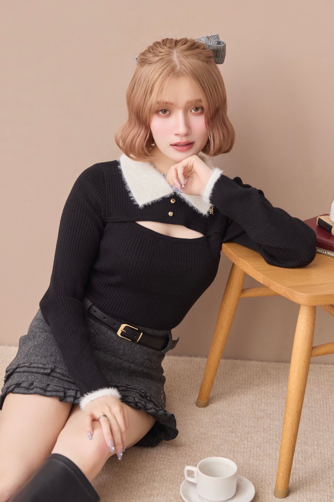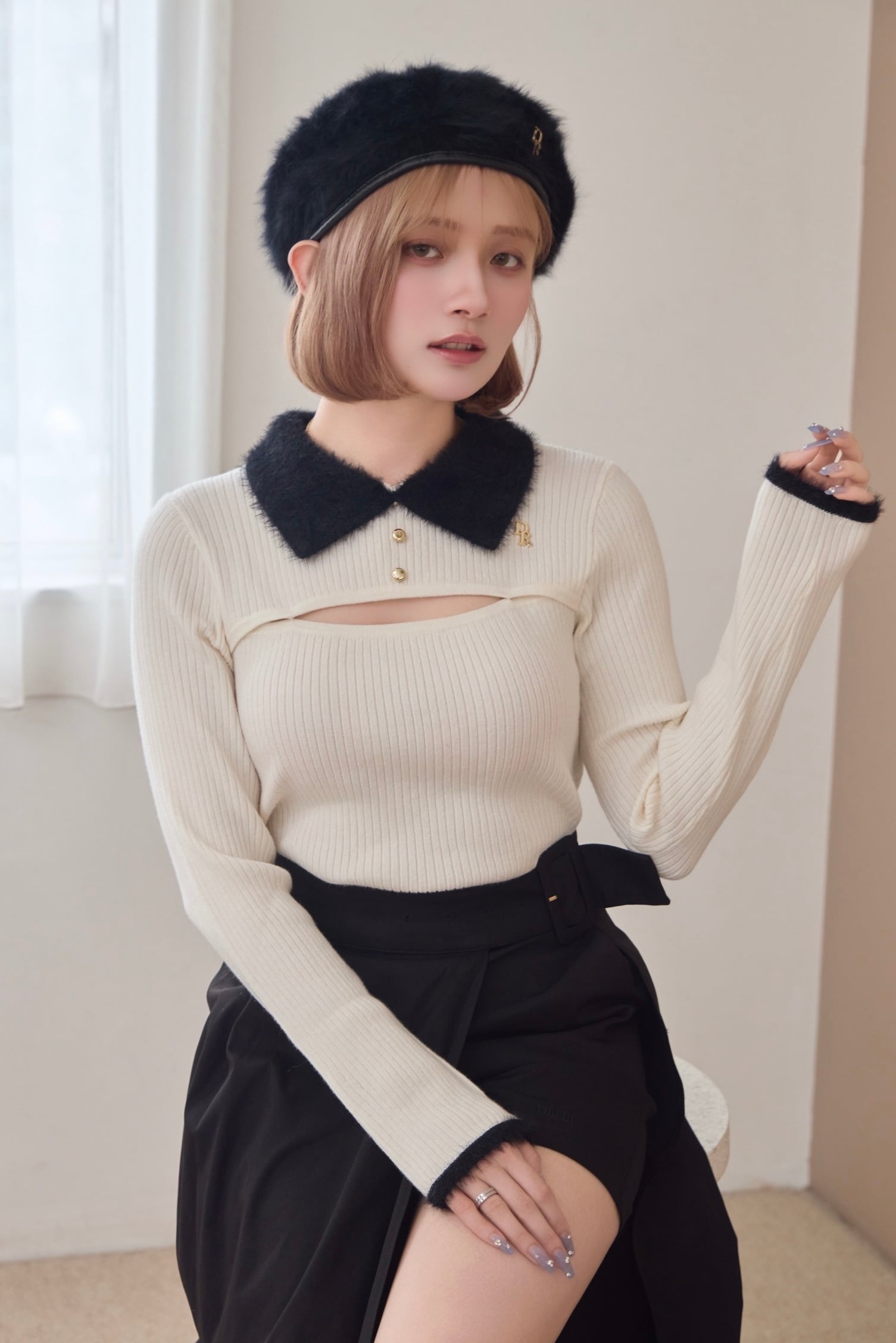 着心地が良い伸縮性に優れたニット素材で編み立て、胸元からちらりと覗く肌見せが上品な色っぽさを引き立てる一着。