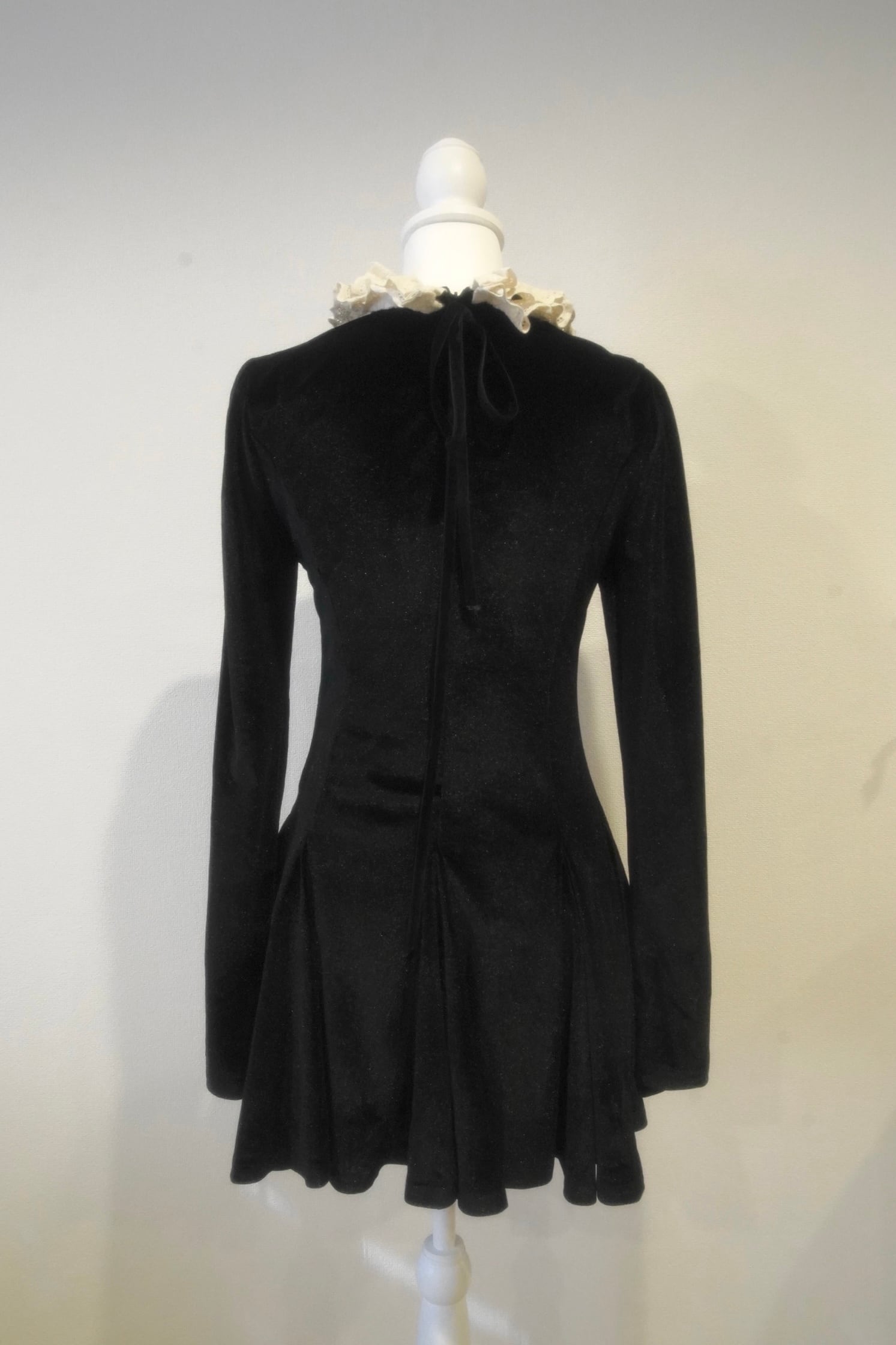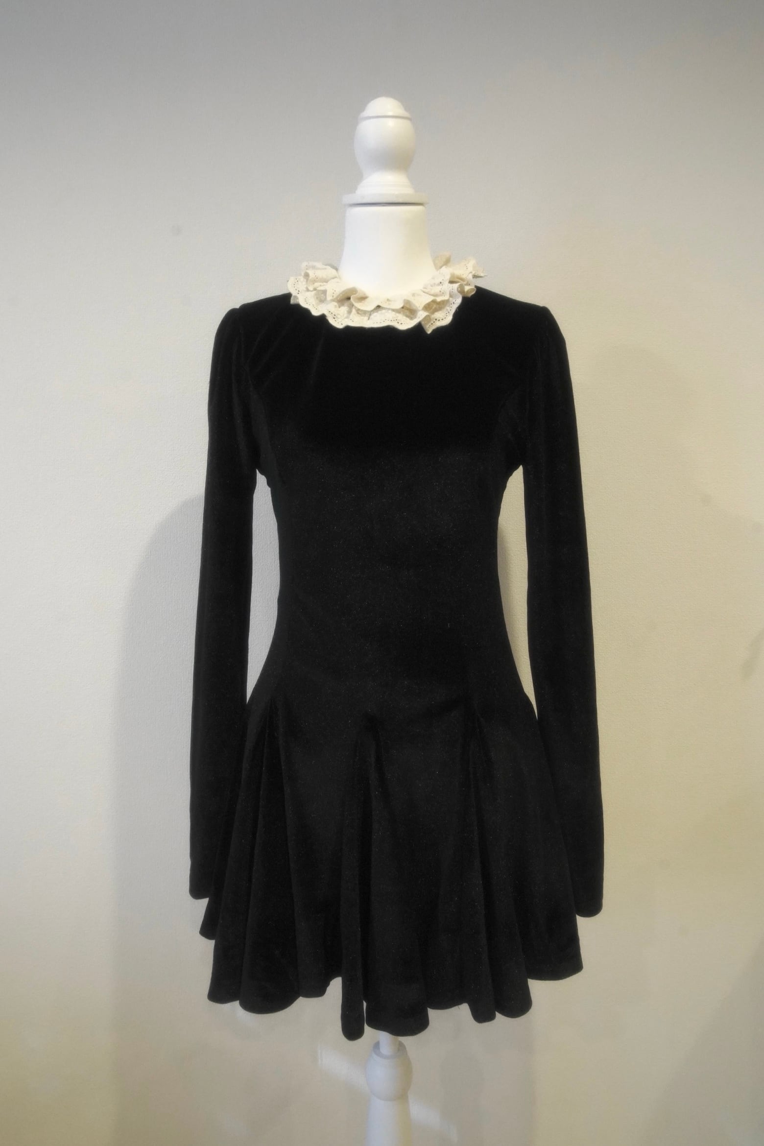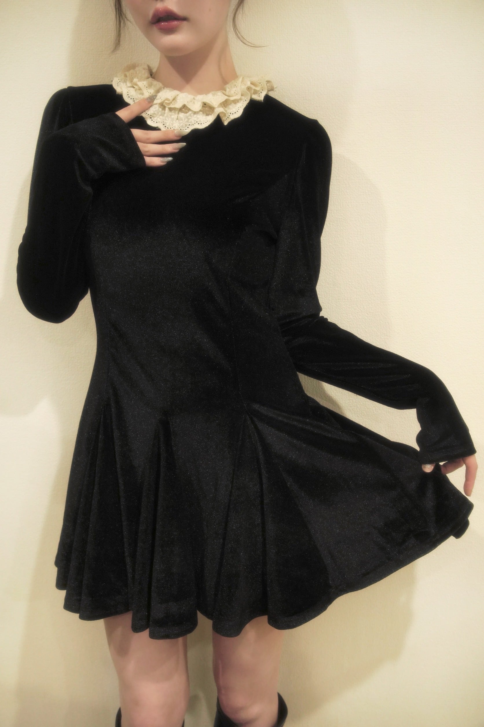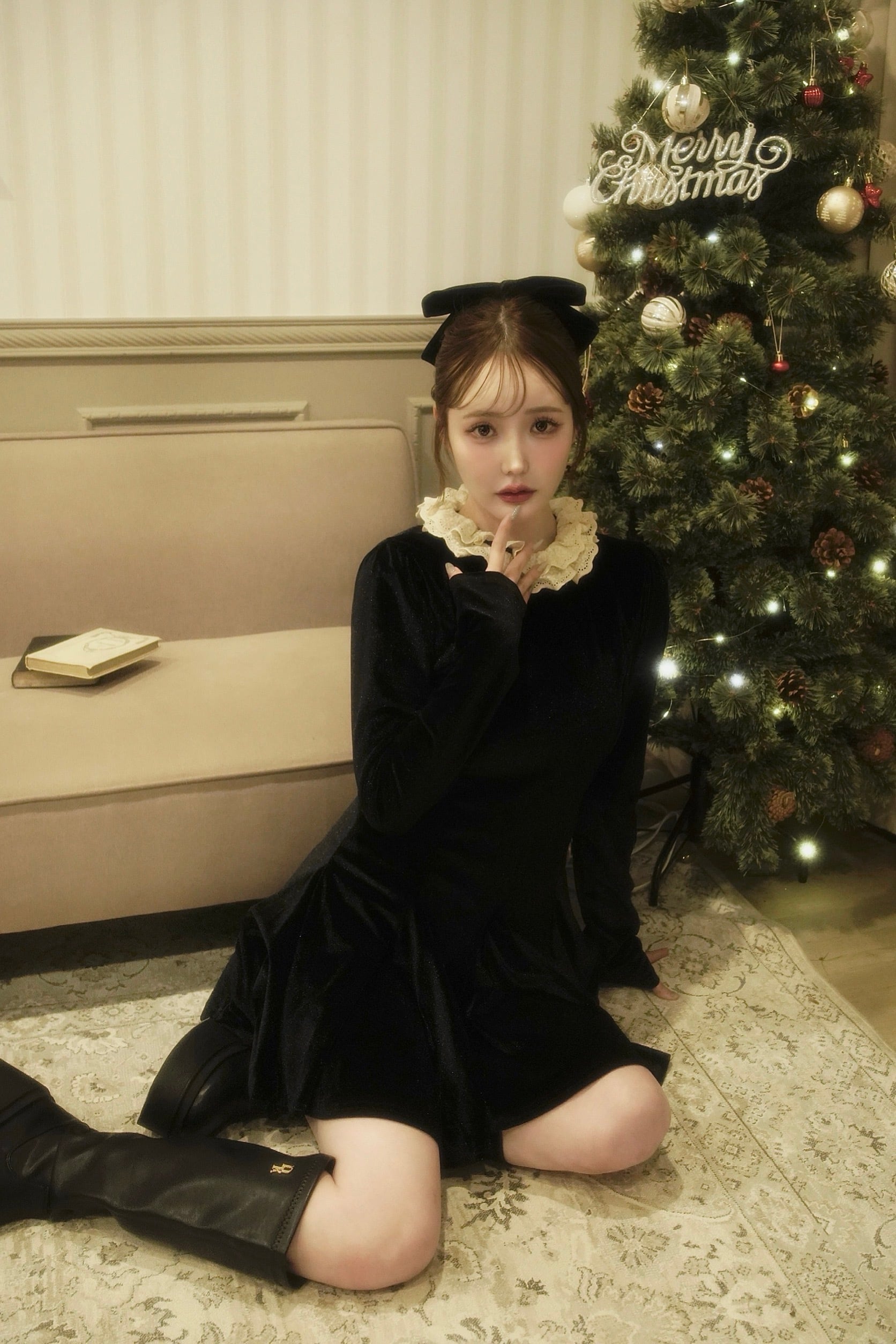 ラグジュアリーなベロア生地と、首元のフリルが存在感を放つ、ホリデーシーズンにぴったりのワンピース。