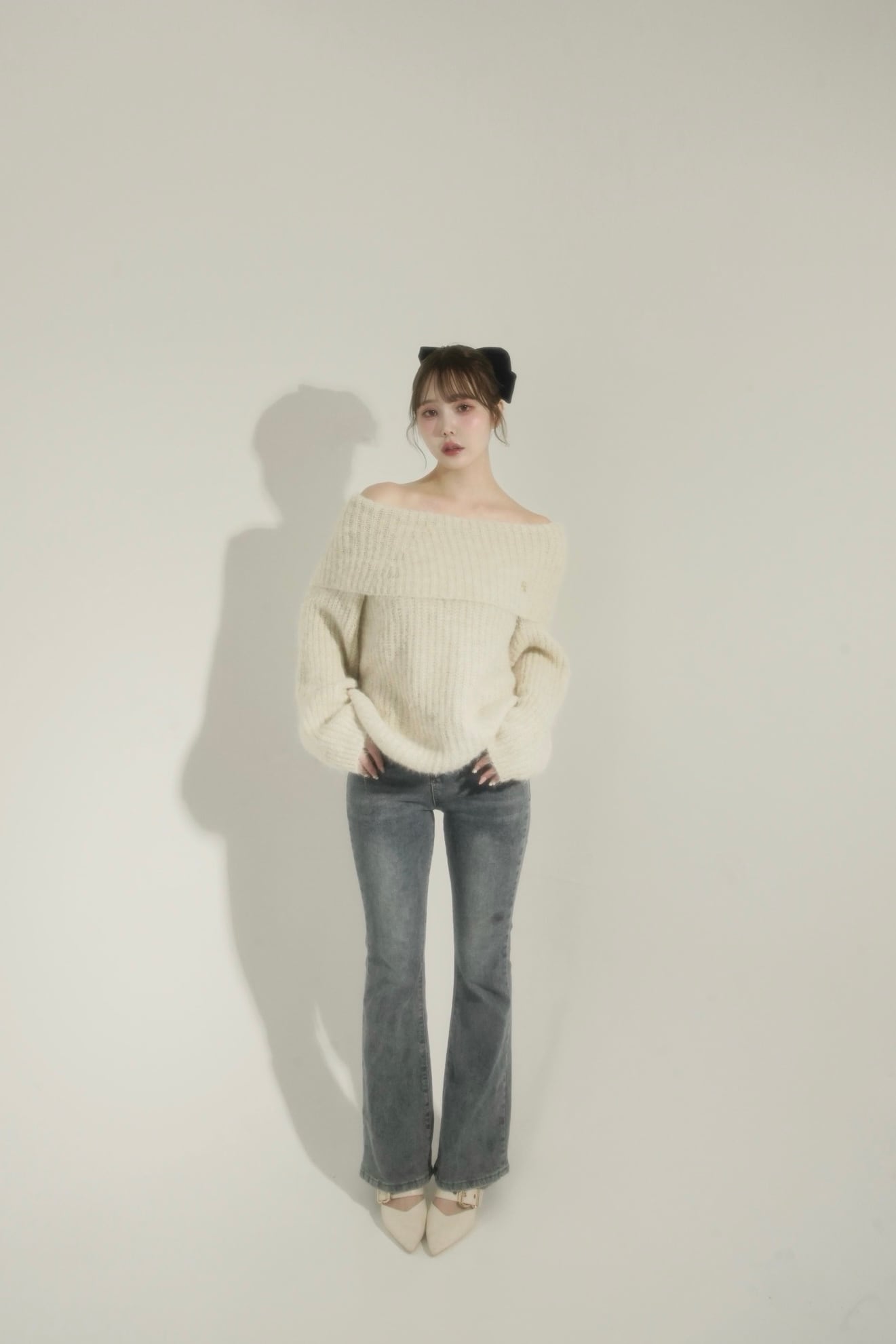 デコルテを美しく魅せるオフショルデザインが、フェミニンな抜け感を演出します。