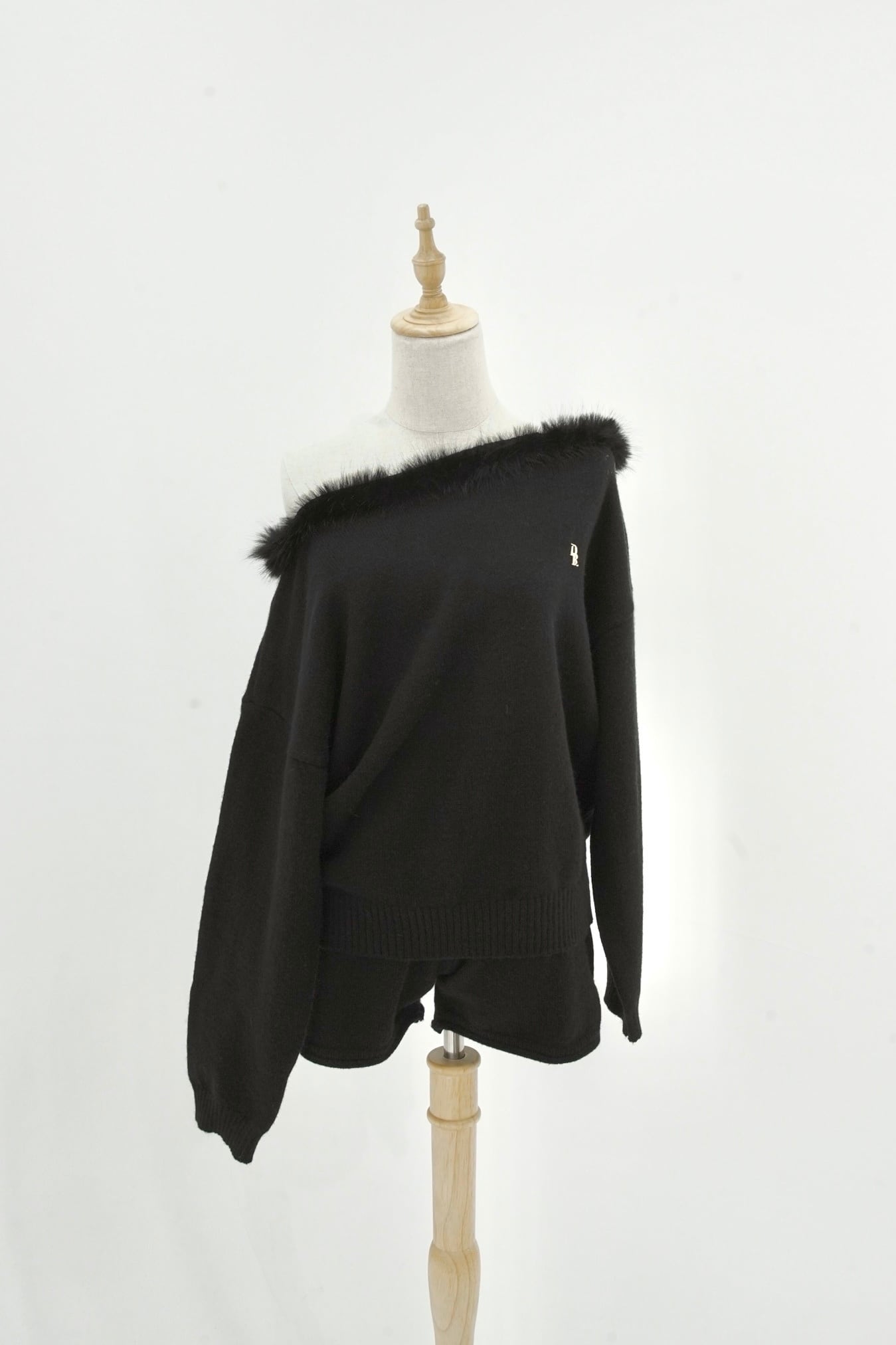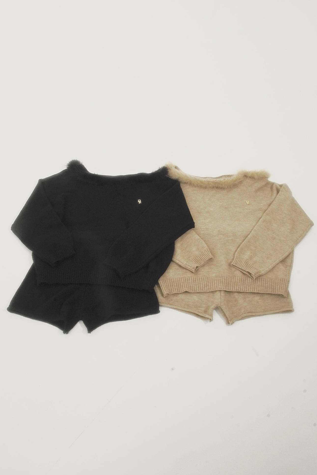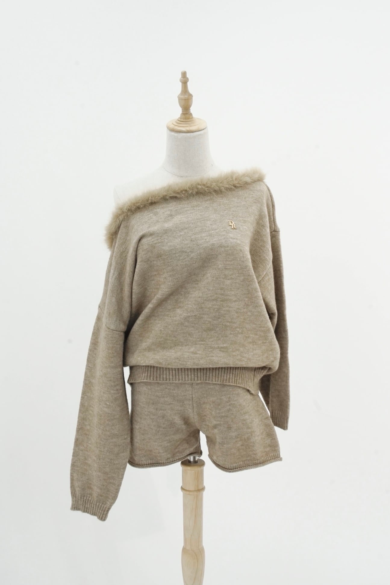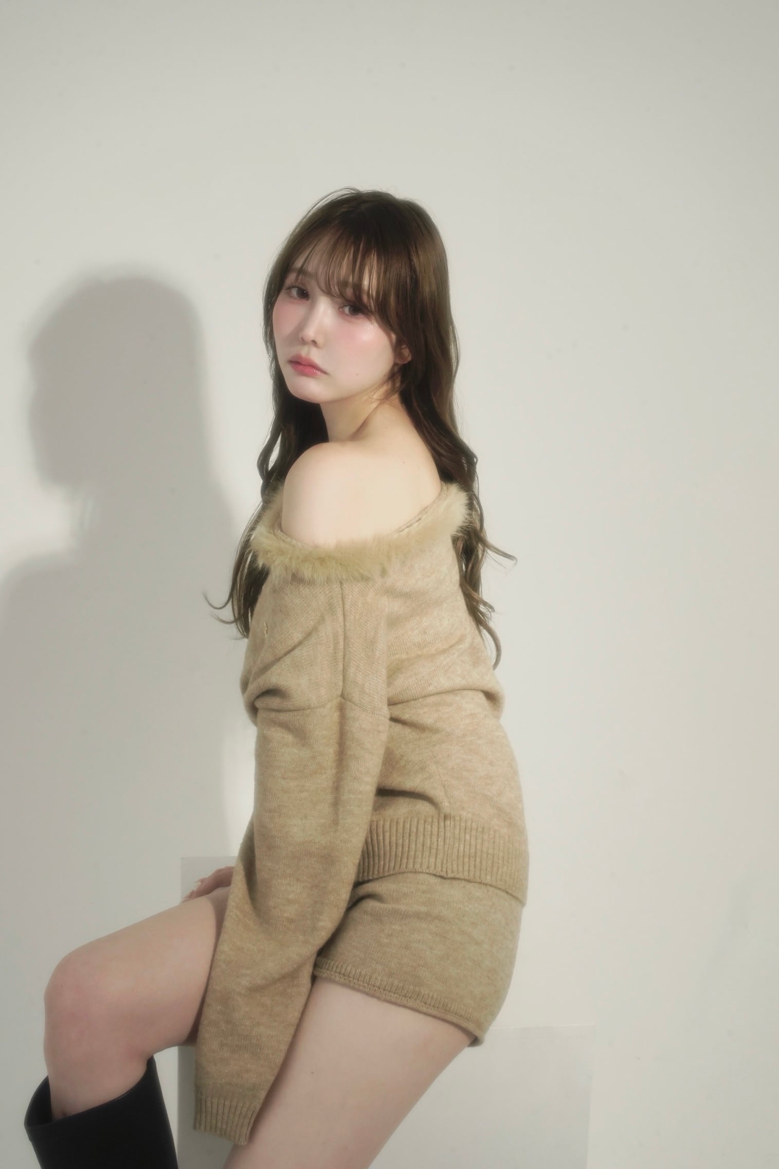 贅沢にあしらったふわふわファーが可愛いニットセットアップ。