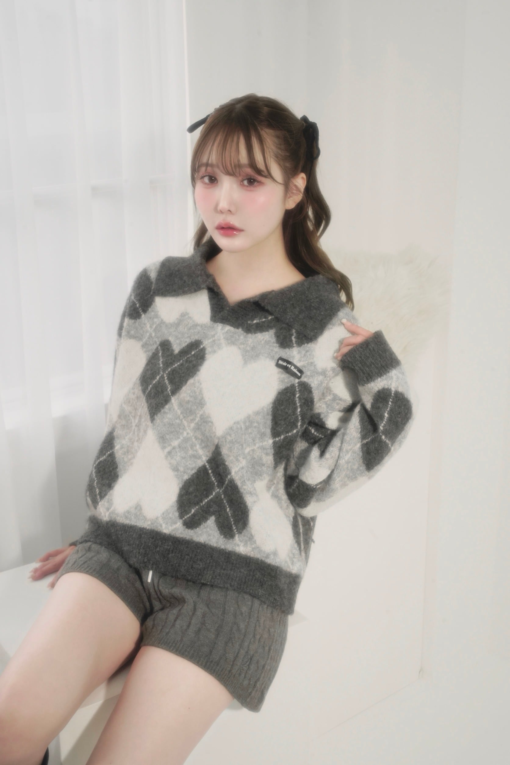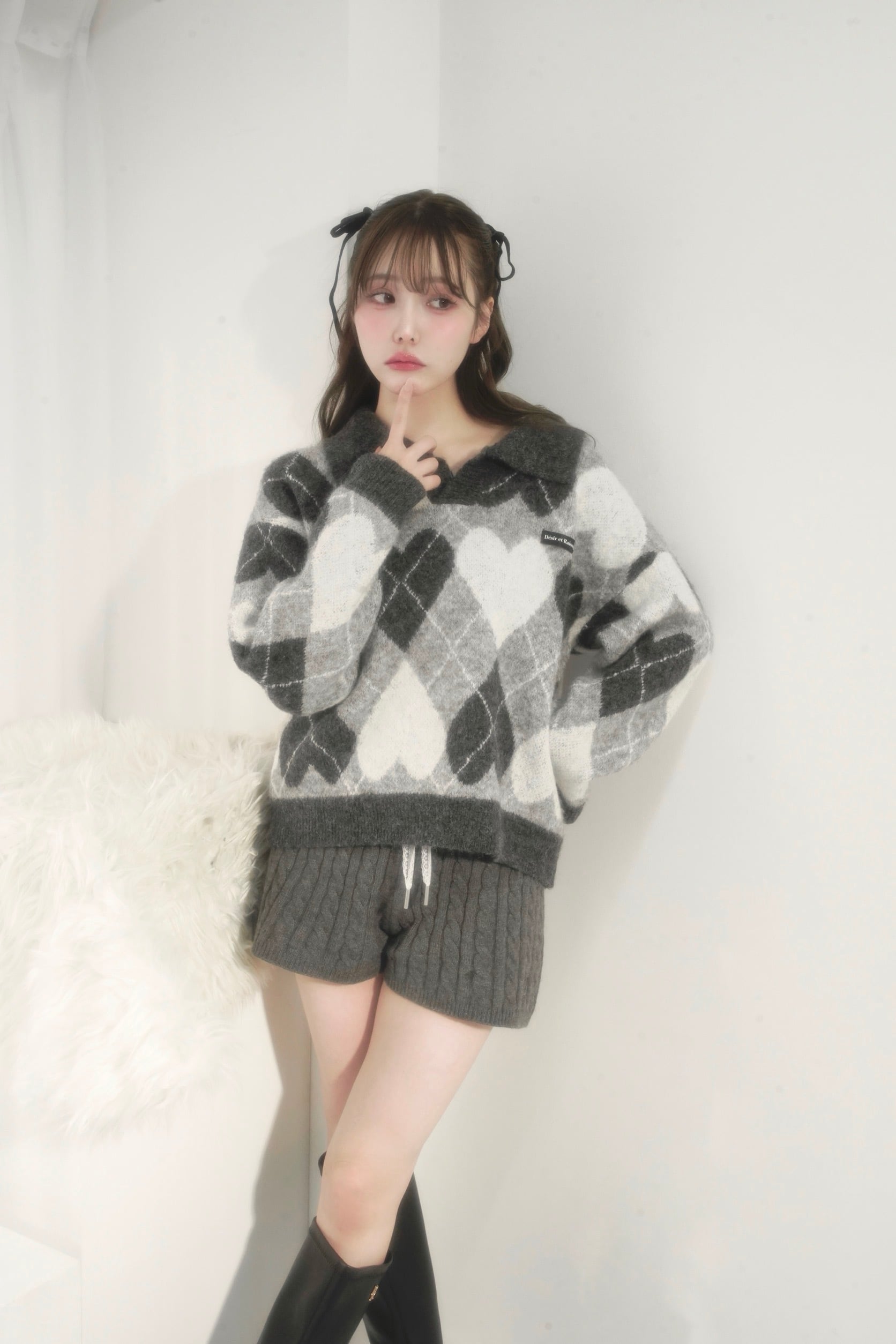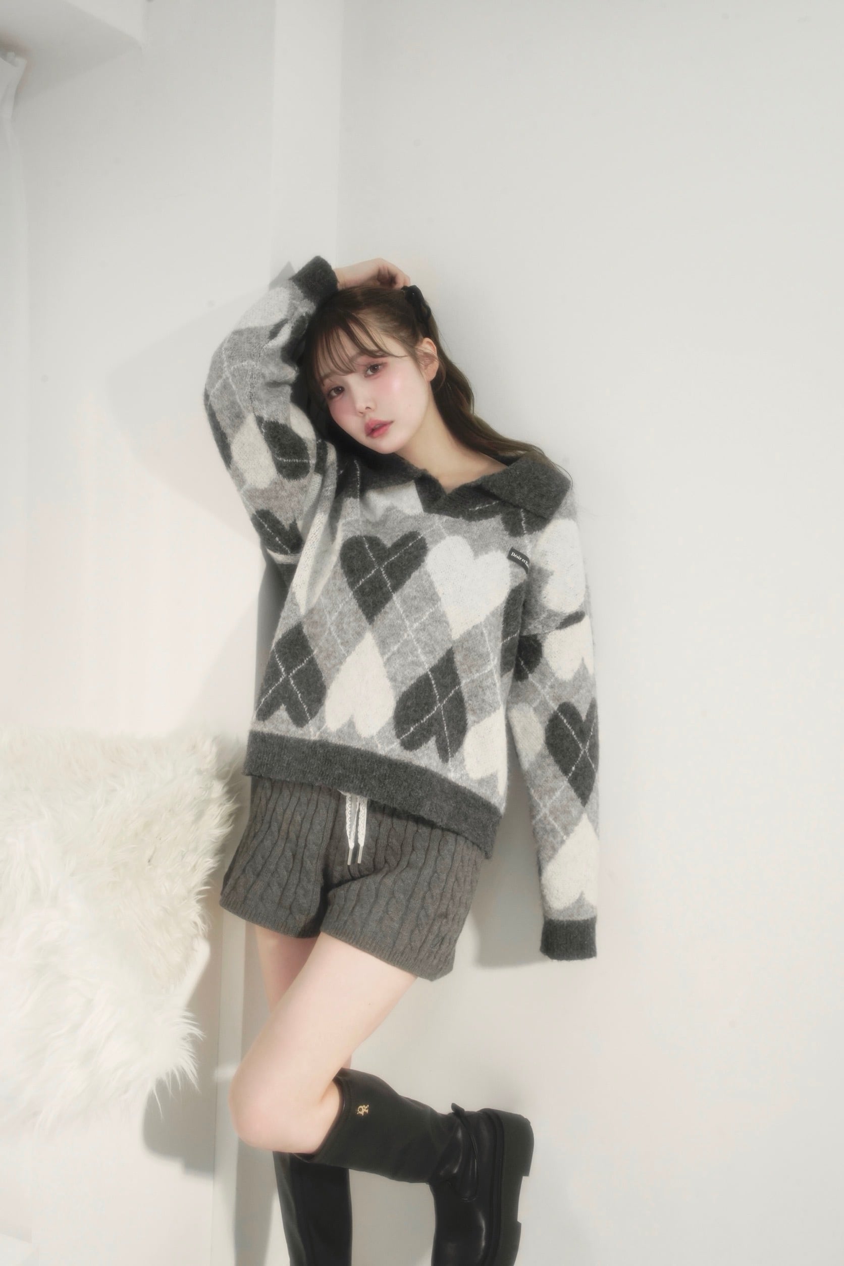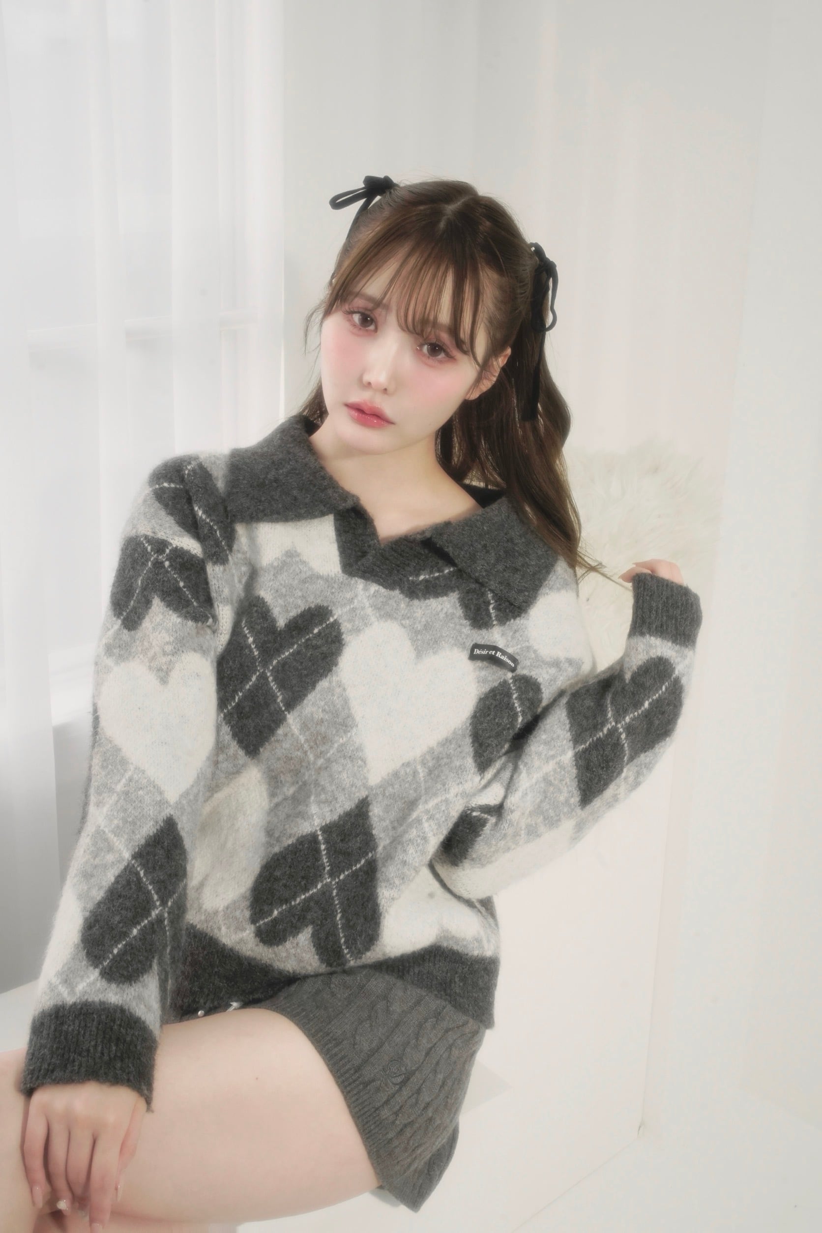 ふわっとしたニット素材に、愛らしいハートモチーフをアーガイル柄に編み立てた、遊び心たっぷりなデザイン。