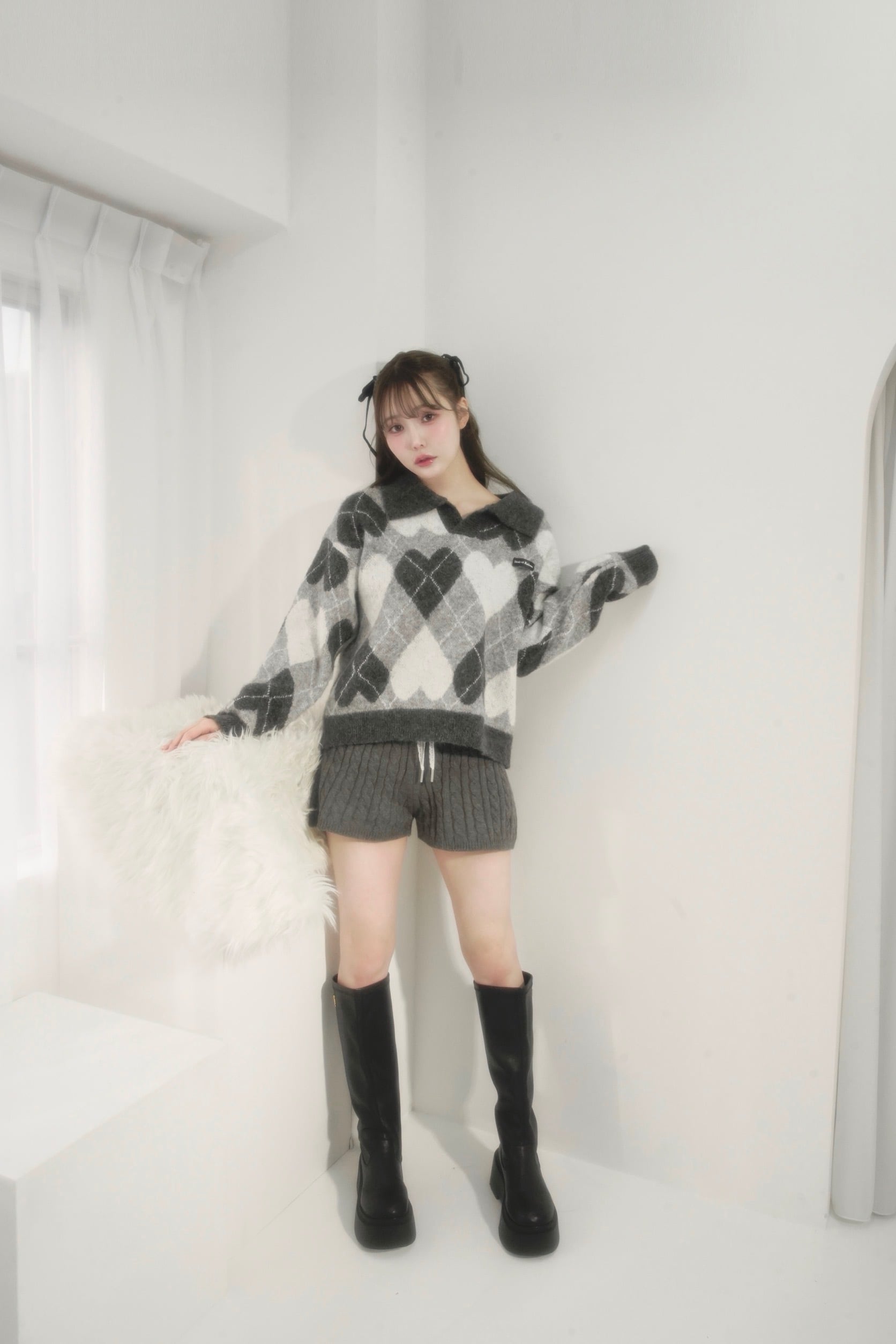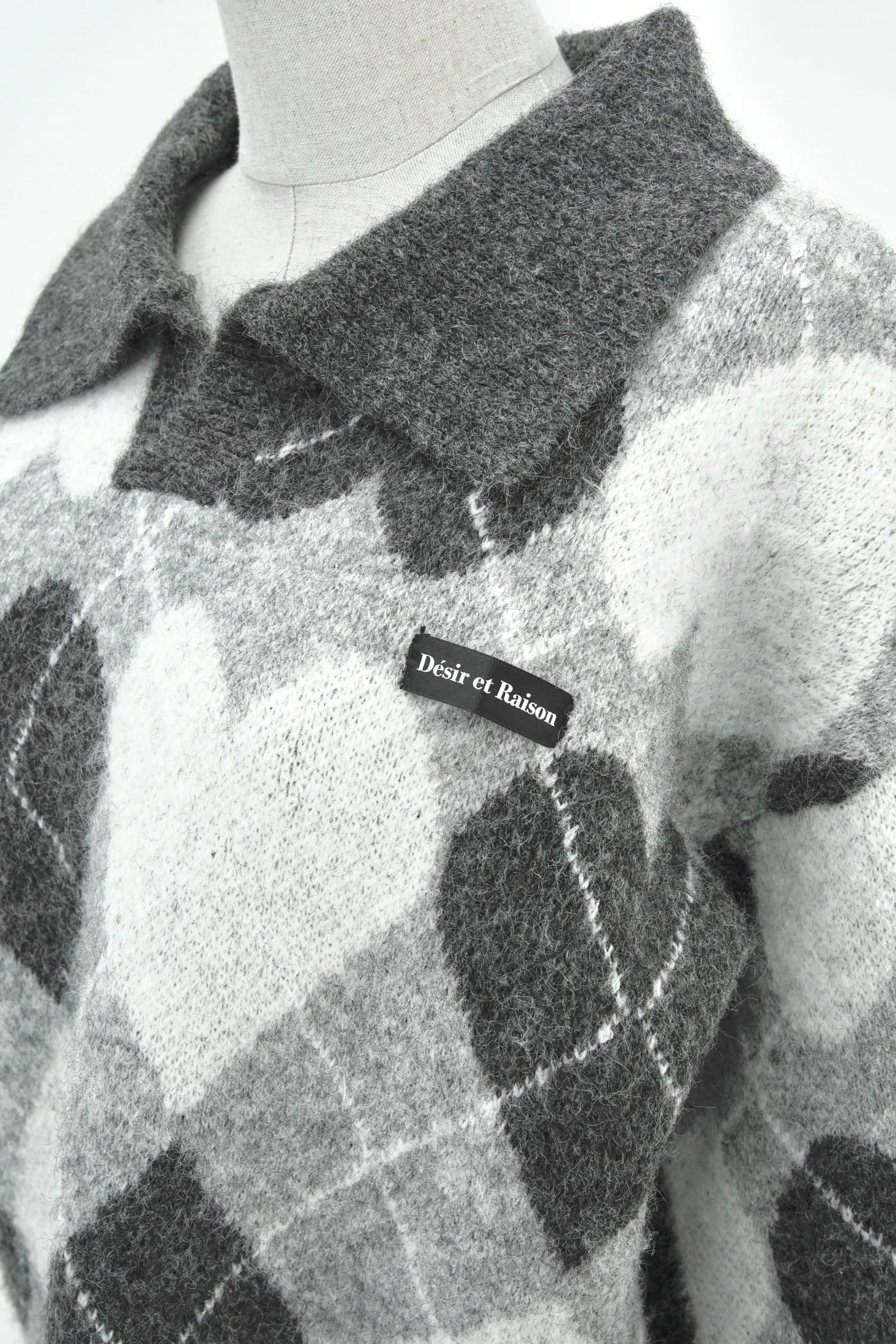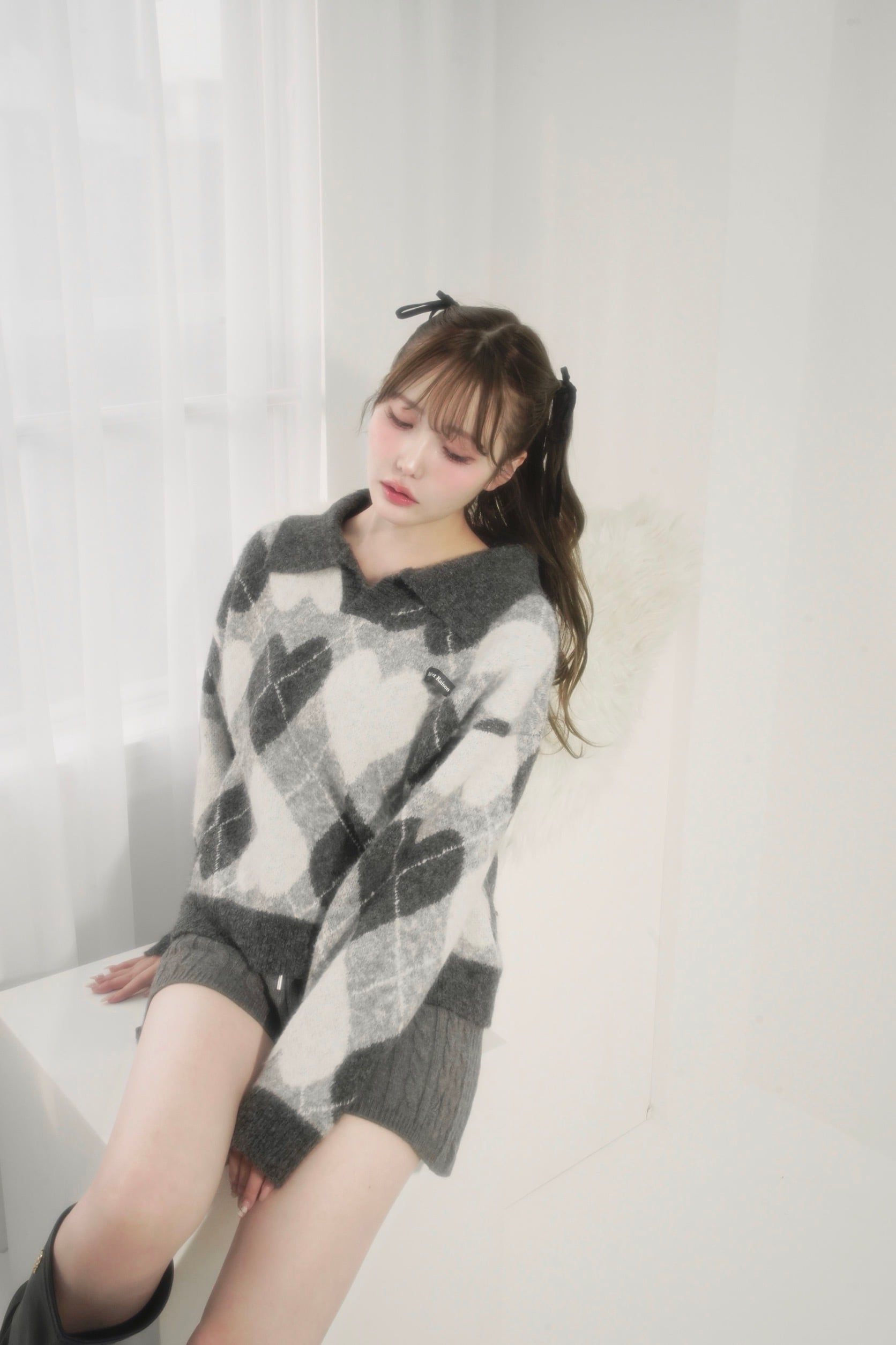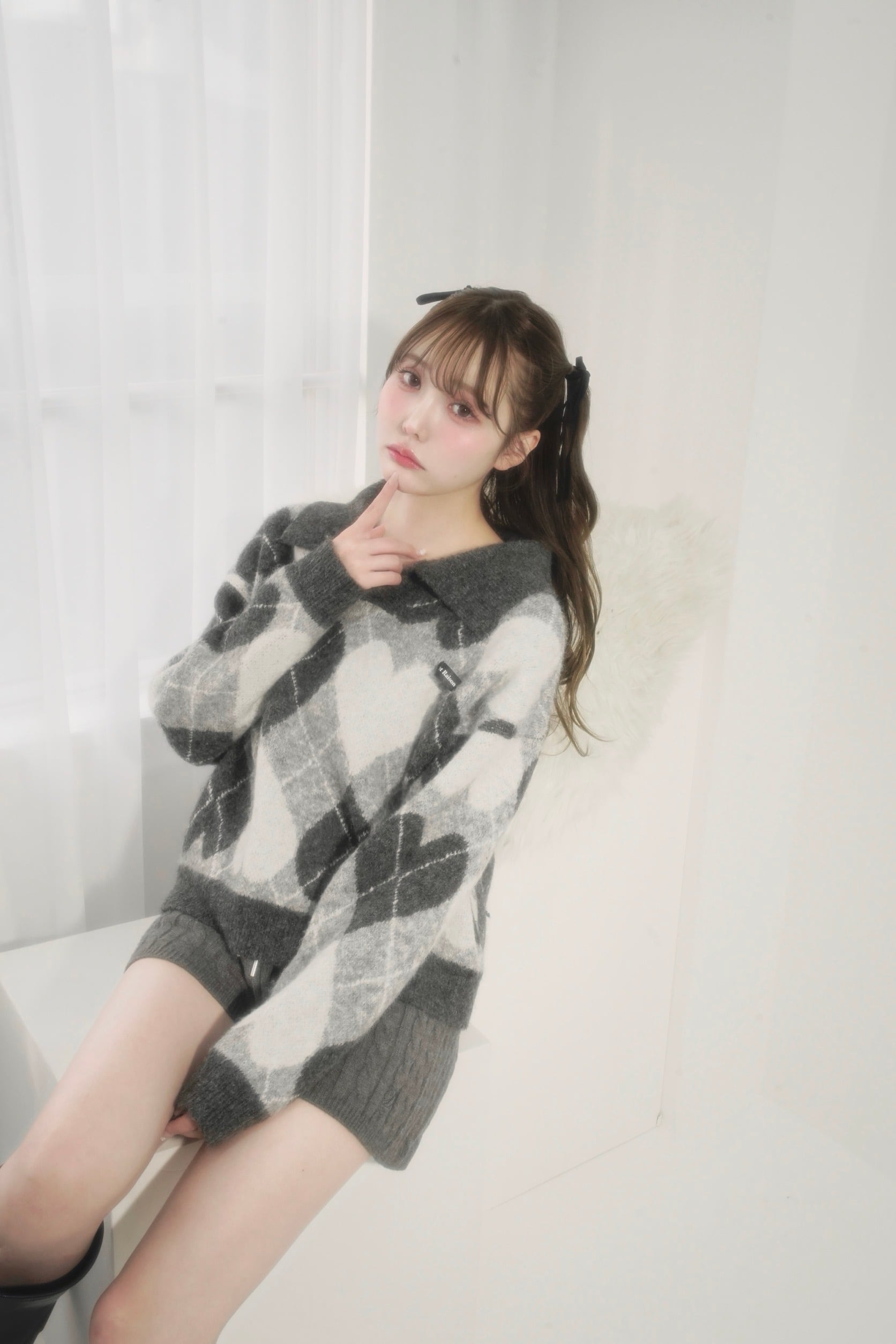 ふわっとしたニット素材に、愛らしいハートモチーフをアーガイル柄に編み立てた、遊び心たっぷりなデザイン。