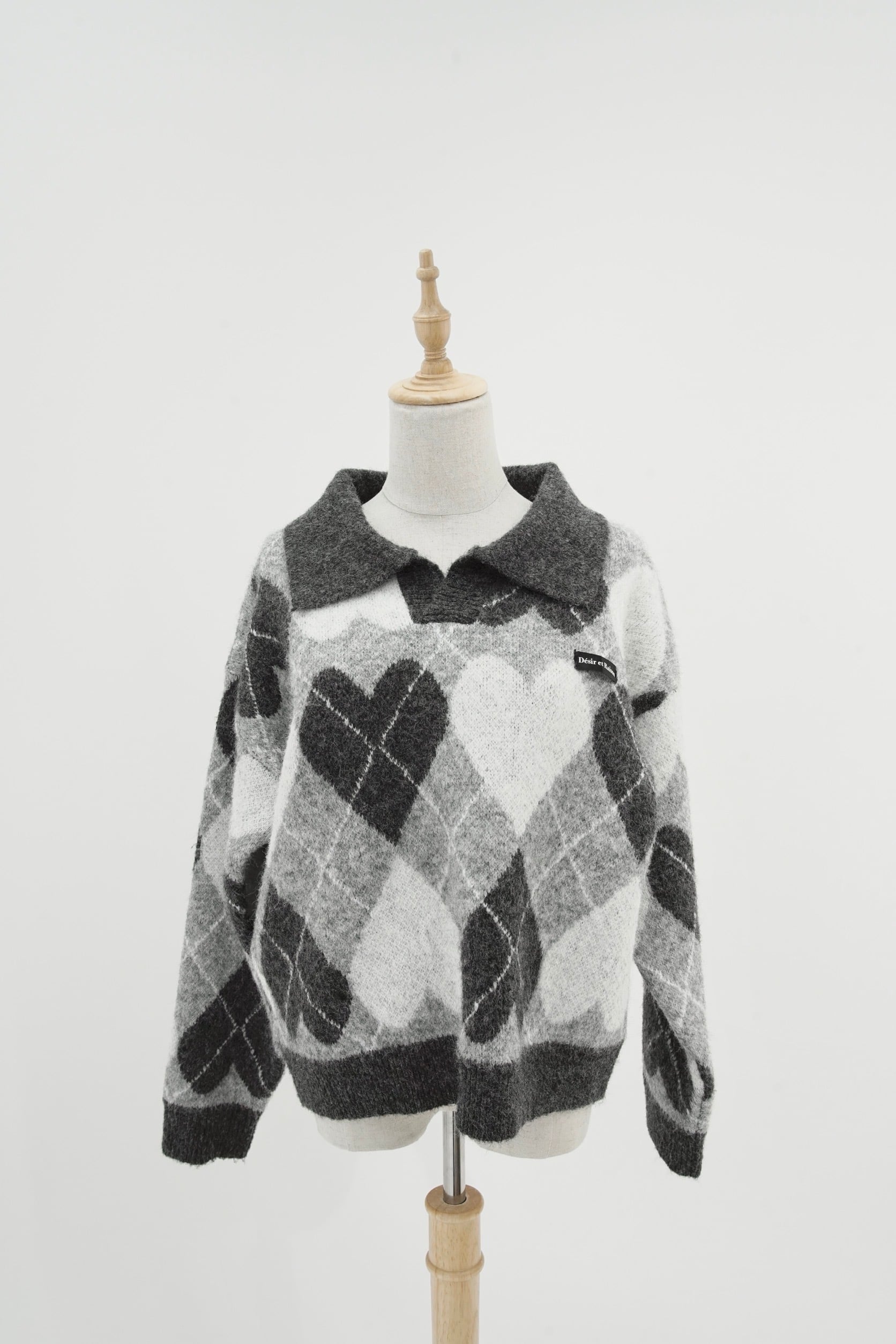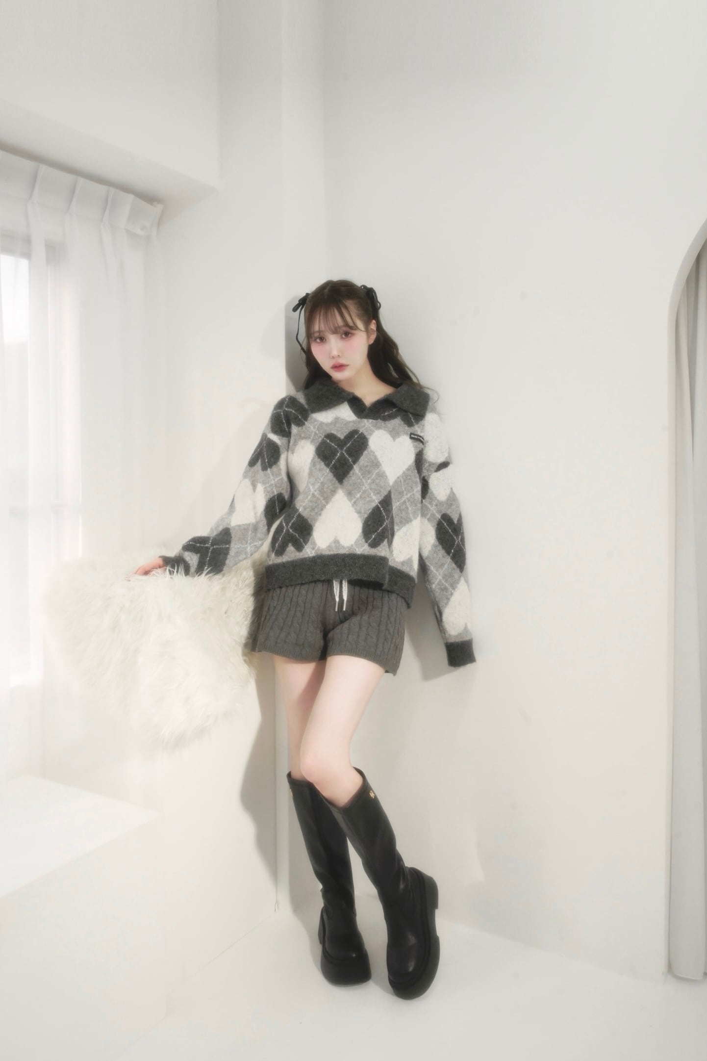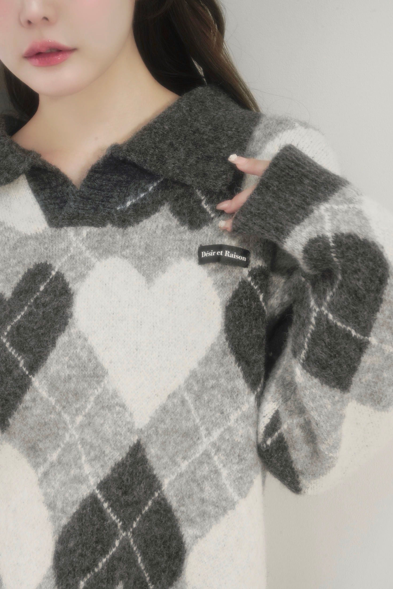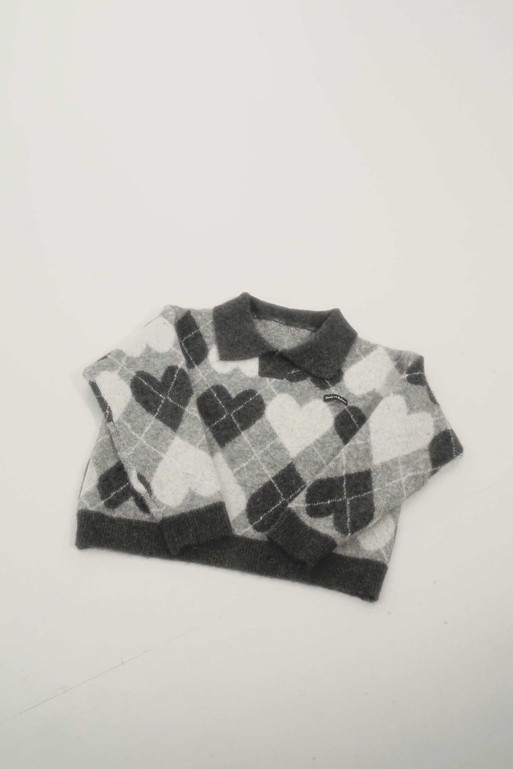 ふわっとしたニット素材に、愛らしいハートモチーフをアーガイル柄に編み立てた、遊び心たっぷりなデザイン。