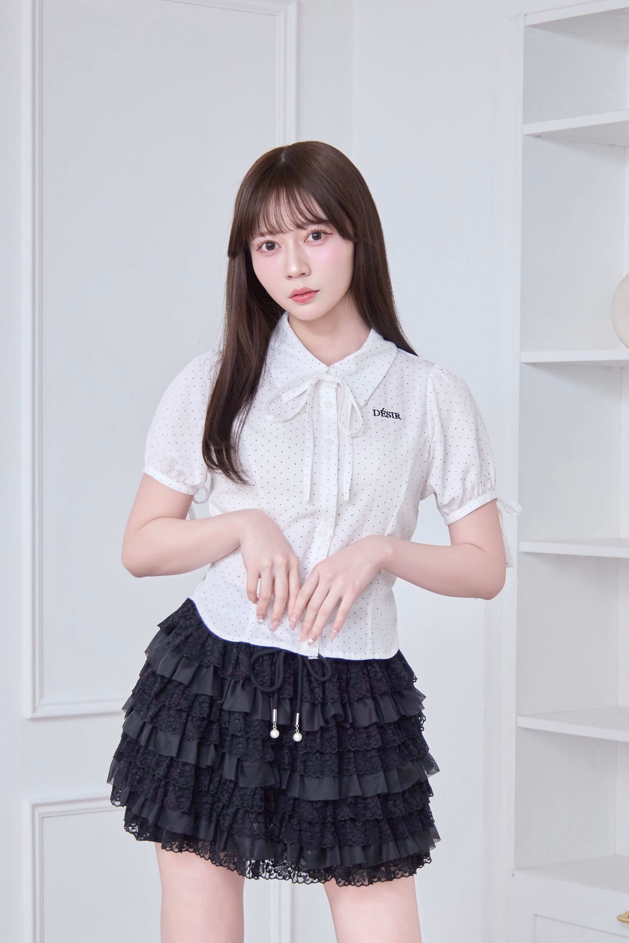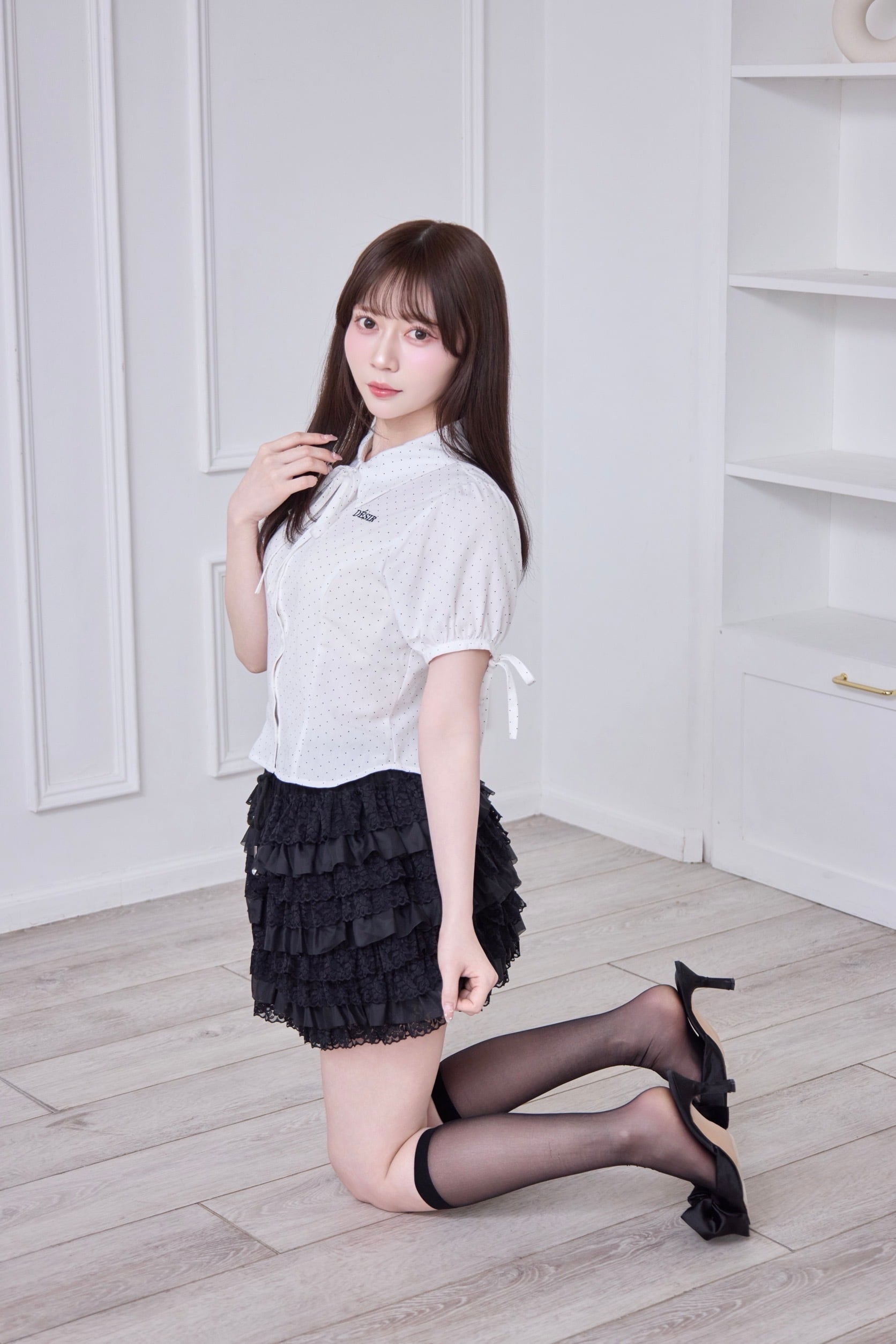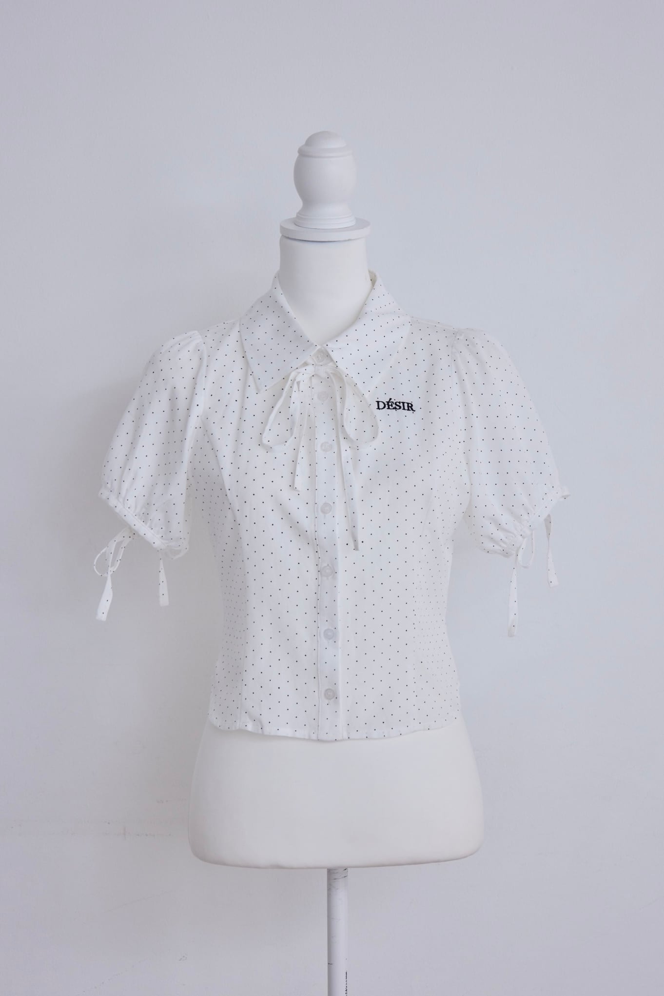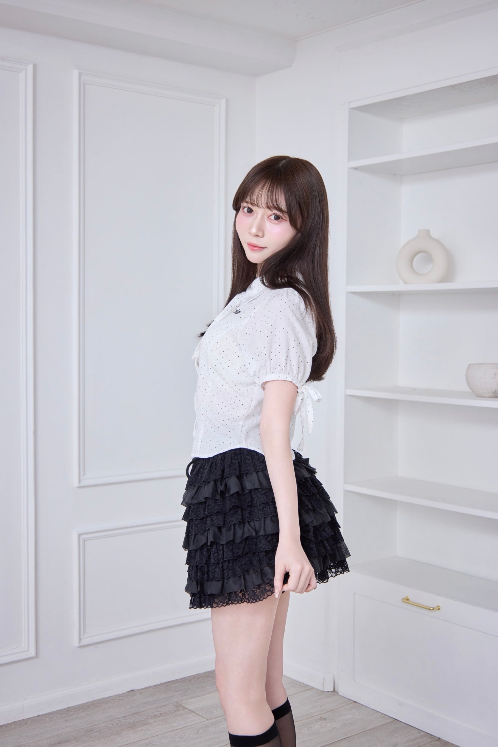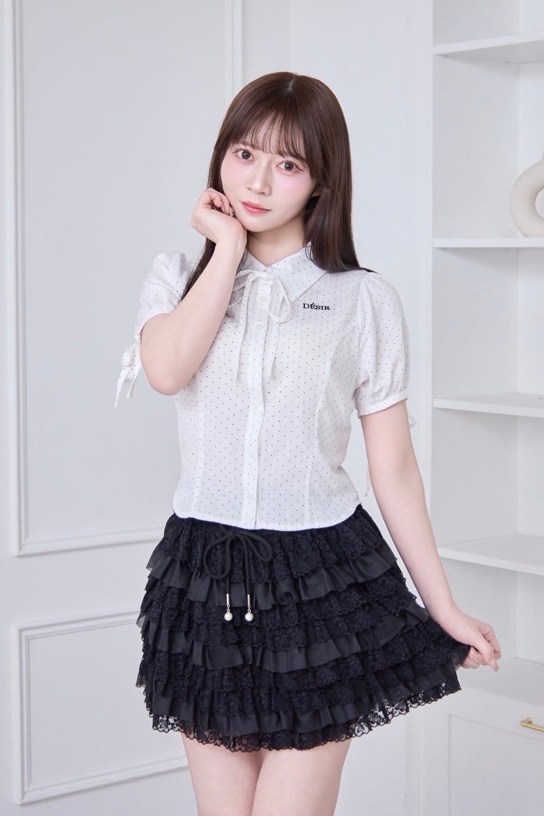 ふんわりとしたパフスリーブに加え、袖口にもリボンをあしらい、細部まで抜かりない可愛さに。